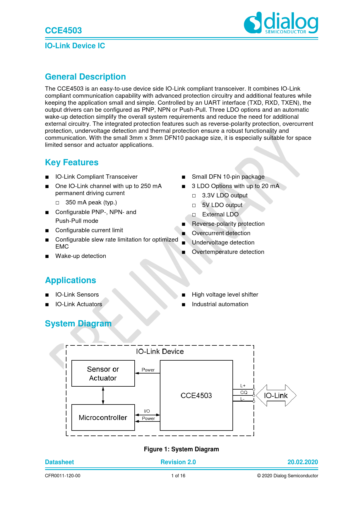 | Pages / Page | 16 / 1 — CCE4503. IO-Link Device IC. General Description. Key Features. … |