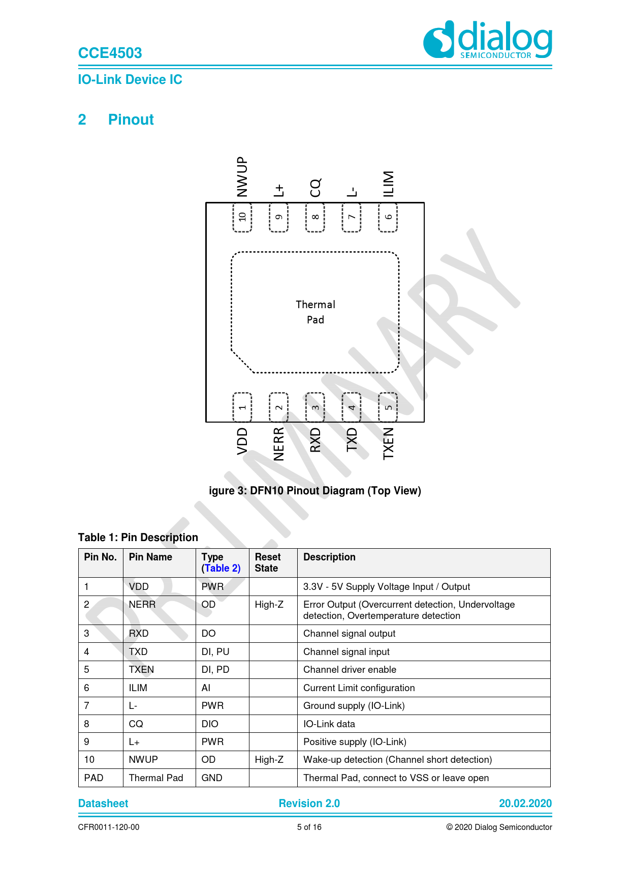| Pages / Page | 16 / 5 — CCE4503. IO-Link Device IC. Pinout. igure 3: DFN10 Pinout Diagram (Top … |