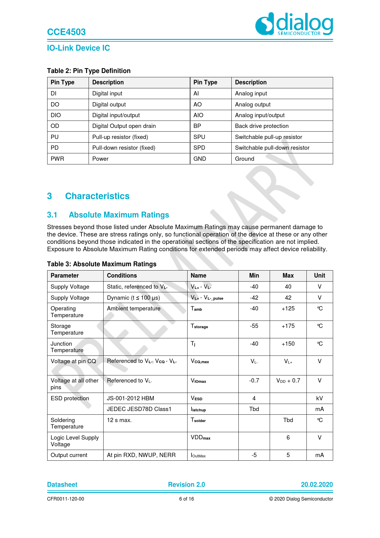 CCE4503. IO-Link Device IC. Table 2: Pin Type Definition. Pin Type. Description. Characteristics. 3.1. Absolute Maximum Ratings