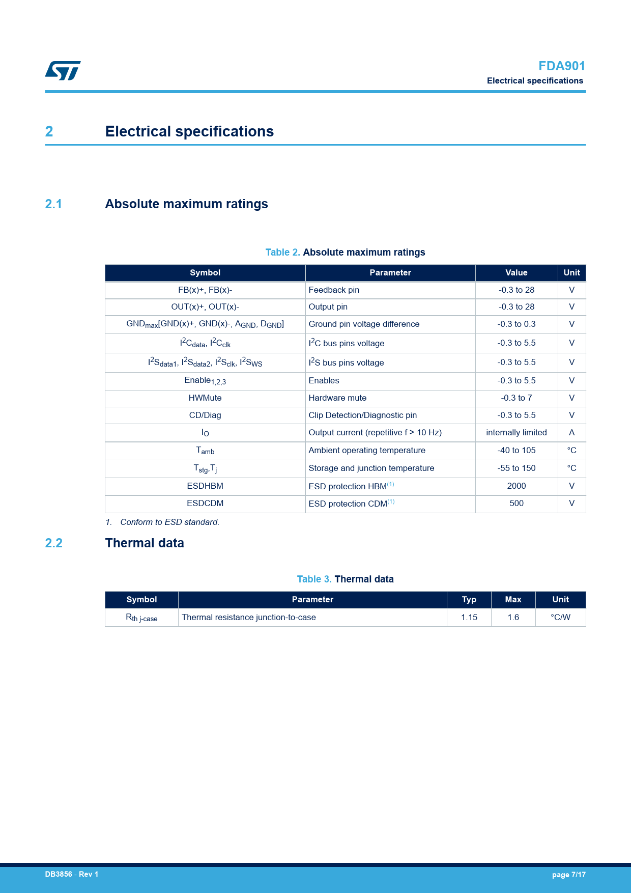 Pages / Page17 / 7 — FDA901. Electrical specifications. 2.1. Absolute maximum ratings. Table …