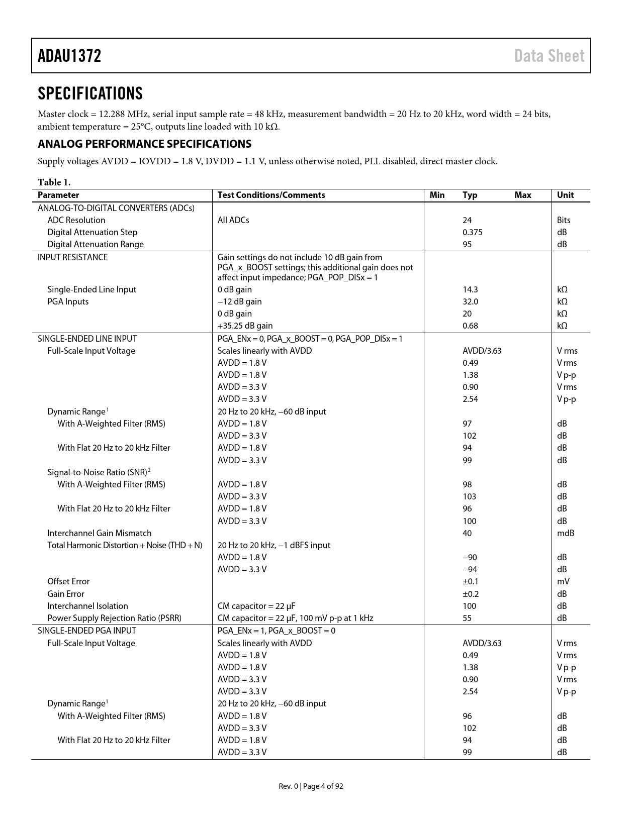 Pages / Page92 / 4 — ADAU1372. Data Sheet. SPECIFICATIONS. ANALOG PERFORMANCE SPECIFICATIONS. …