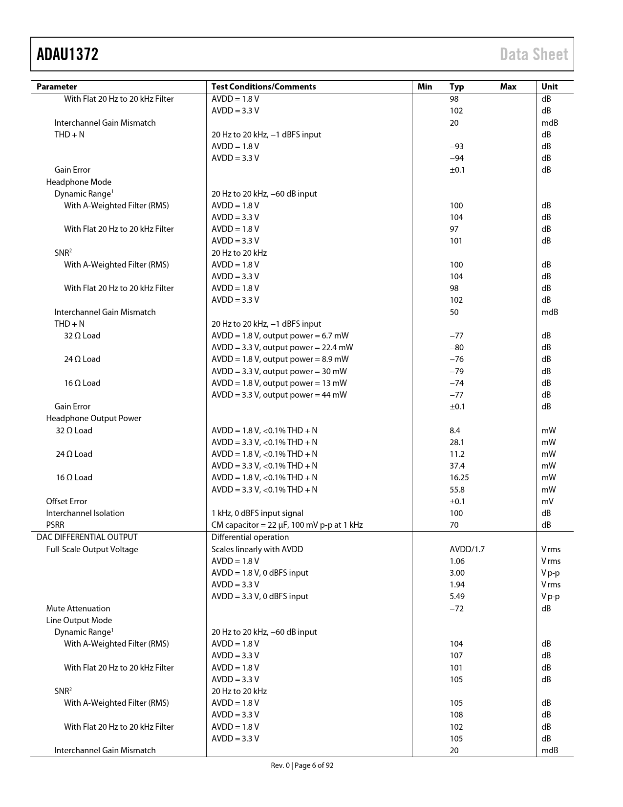Pages / Page92 / 6 — ADAU1372. Data Sheet. Parameter. Test Conditions/Comments. Min. Typ. Max. …