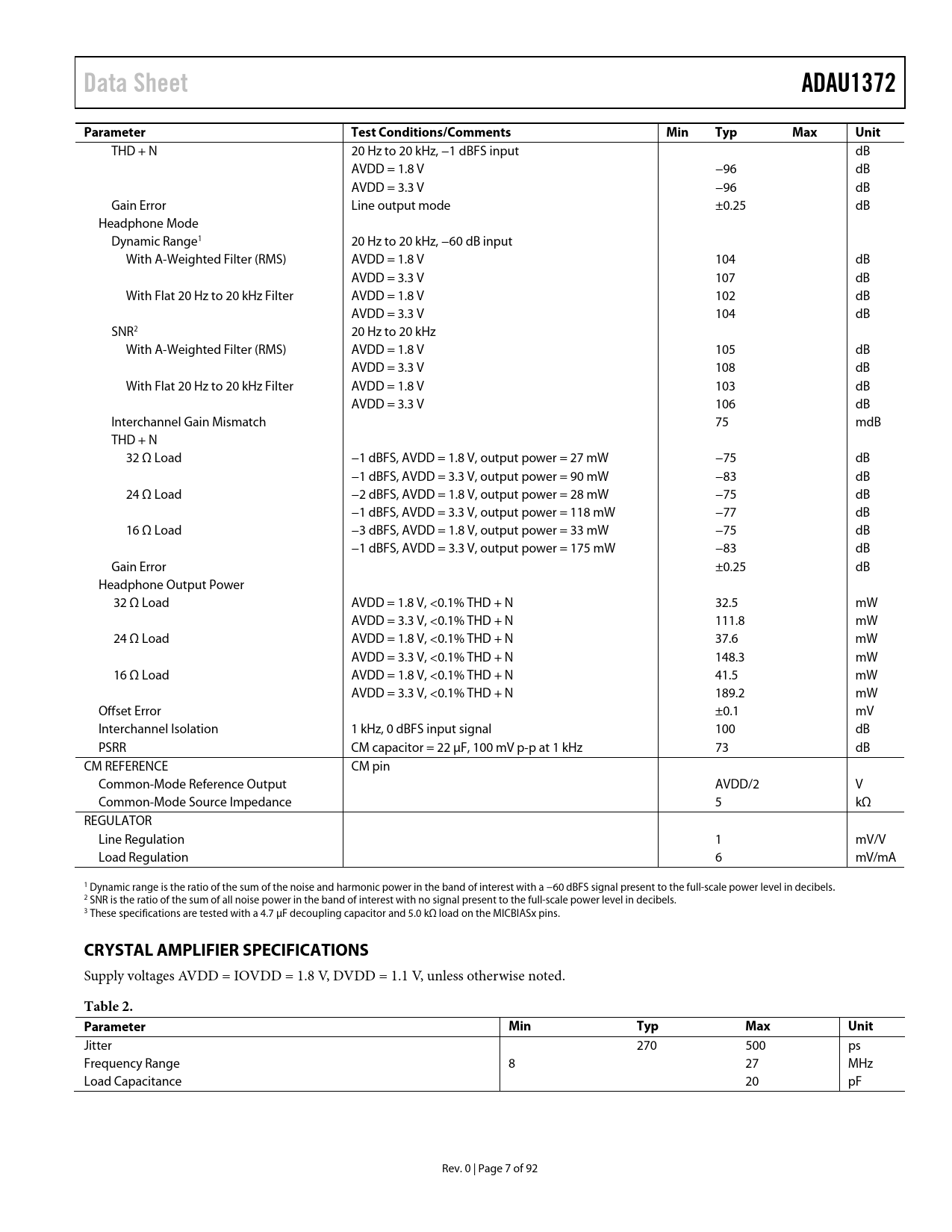 Data Sheet ADAU1372 Parameter Test Conditions/Comments Min Typ Max Unit CRYSTAL AMPLIFIER SPECIFICATIONS Table 2 Parameter