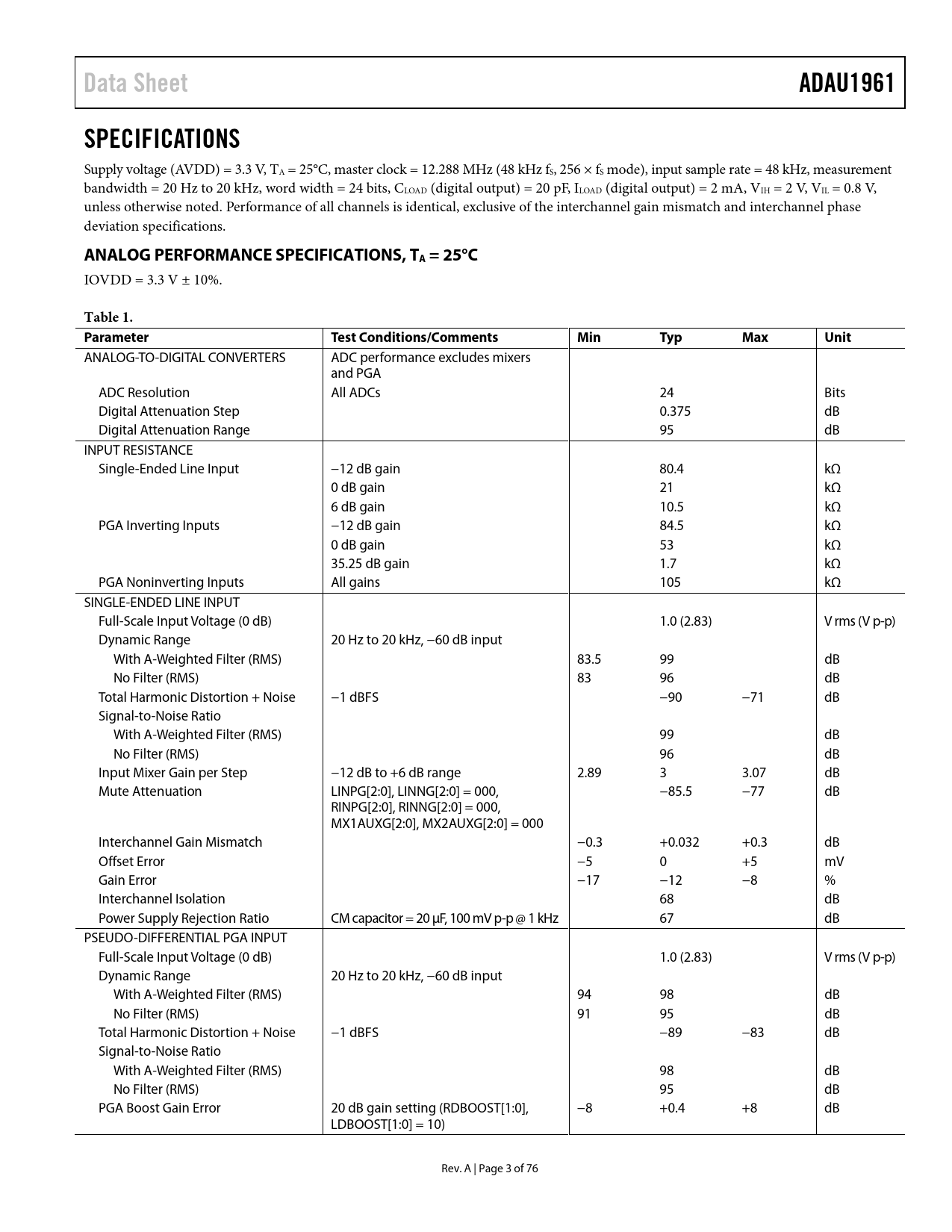 Pages / Page76 / 3 — Data Sheet. ADAU1961. SPECIFICATIONS. ANALOG PERFORMANCE SPECIFICATIONS, …