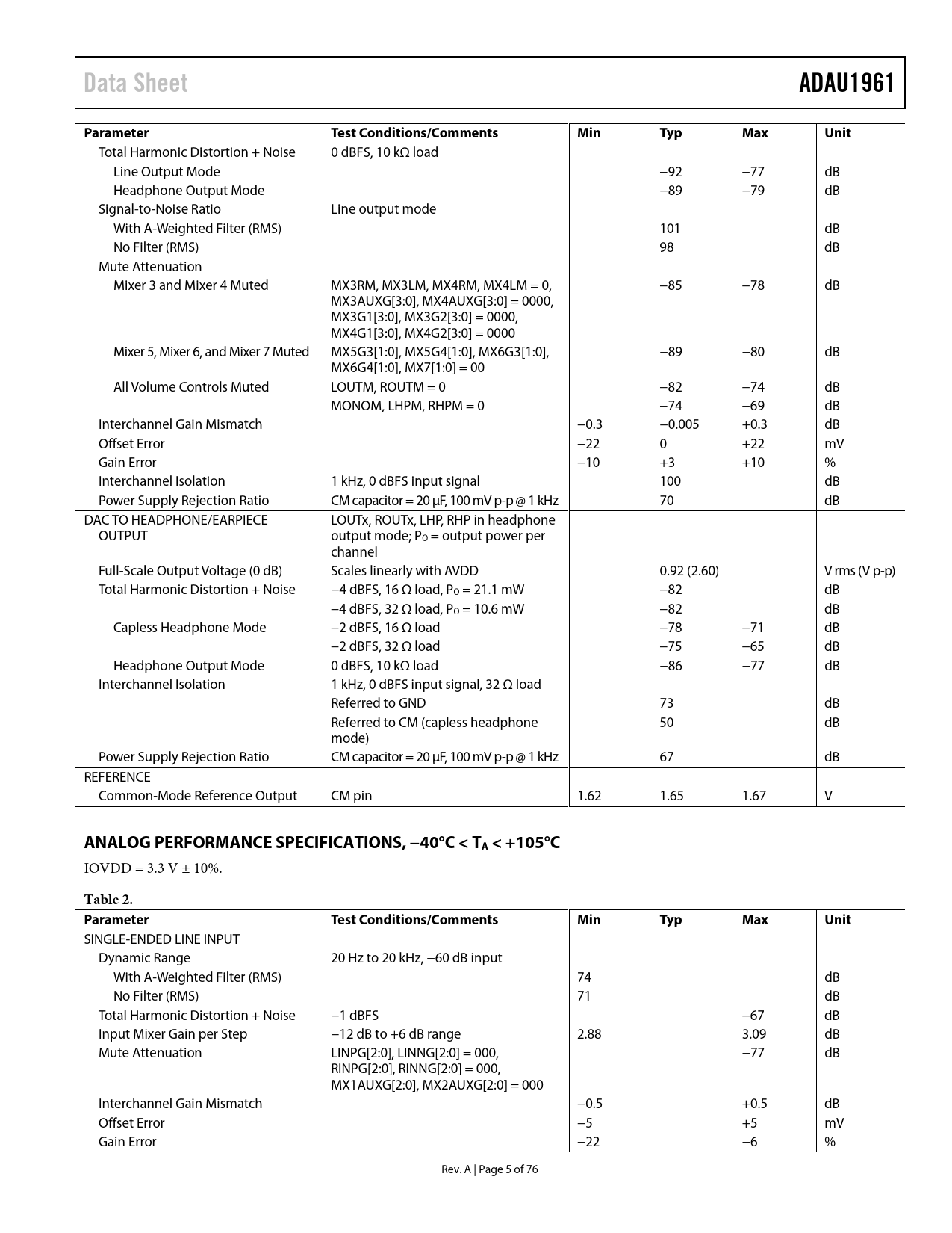 Pages / Page76 / 5 — Data Sheet. ADAU1961. Parameter. Test Conditions/Comments. Min. Typ. Max. …