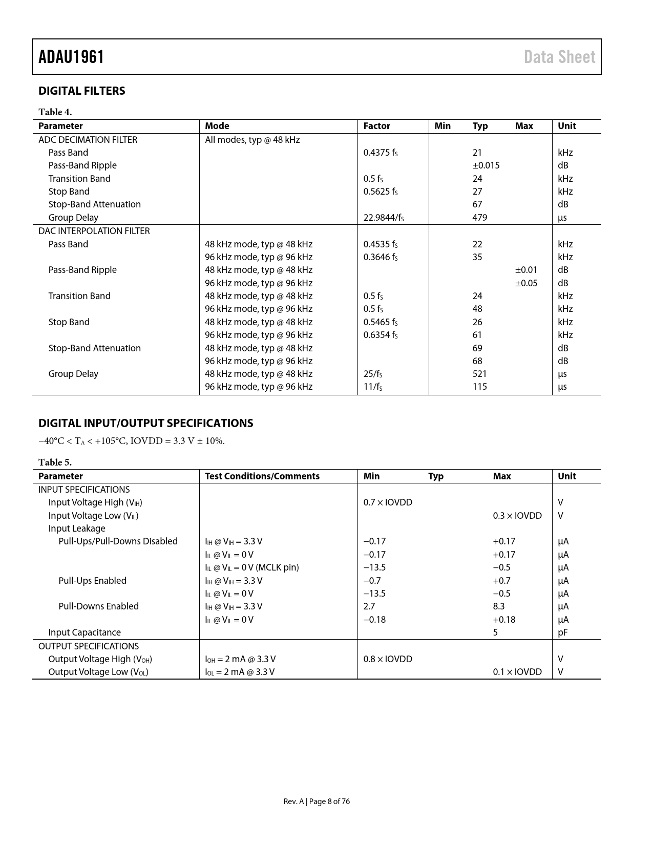 ADAU1961Data SheetDIGITAL FILTERSTable 4. ParameterModeFactorMinTypMaxUnit ADC DECIMATION FILTER All modes, typ @ 48 kHz Pass Band 0.4375 fS 21 kHz Pass-Band Ripple ±0.015 dB Transition Band 0.5 fS 24 kHz Stop Band 0.5625 fS 27 kHz Stop-Band Attenuation 67 dB Group Delay 22.9844/fS 479 µs DAC INTERPOLATION FILTER Pass Band 48 kHz mode, typ @ 48 kHz 0.4535 fS 22 kHz 96 kHz mode, typ @ 96 kHz 0.3646 fS 35 kHz Pass-Band Ripple 48 kHz mode, typ @ 48 kHz ±0.01 dB 96 kHz mode, typ @ 96 kHz ±0.05 dB Transition Band 48 kHz mode, typ @ 48 kHz 0.5 fS 24 kHz 96 kHz mode, typ @ 96 kHz 0.5 fS 48 kHz Stop Band 48 kHz mode, typ @ 48 kHz 0.5465 fS 26 kHz 96 kHz mode, typ @ 96 kHz 0.6354 fS 61 kHz Stop-Band Attenuation 48 kHz mode, typ @ 48 kHz 69 dB 96 kHz mode, typ @ 96 kHz 68 dB Group Delay 48 kHz mode, typ @ 48 kHz 25/fS 521 µs 96 kHz mode, typ @ 96 kHz 11/fS 115 µs DIGITAL INPUT/OUTPUT SPECIFICATIONS −40°C < TA < +105°C, IOVDD = 3.3 V ± 10%. Table 5. ParameterTest Conditions/CommentsMinTypMaxUnit INPUT SPECIFICATIONS Input Voltage High (VIH) 0.7 × IOVDD V Input Voltage Low (VIL) 0.3 × IOVDD V Input Leakage Pull-Ups/Pull-Downs Disabled IIH @ VIH = 3.3 V −0.17 +0.17 µA IIL @ VIL = 0 V −0.17 +0.17 µA IIL @ VIL = 0 V (MCLK pin) −13.5 −0.5 µA Pull-Ups Enabled IIH @ VIH = 3.3 V −0.7 +0.7 µA IIL @ VIL = 0 V −13.5 −0.5 µA Pull-Downs Enabled IIH @ VIH = 3.3 V 2.7 8.3 µA IIL @ VIL = 0 V −0.18 +0.18 µA Input Capacitance 5 pF OUTPUT SPECIFICATIONS Output Voltage High (VOH) IOH = 2 mA @ 3.3 V 0.8 × IOVDD V Output Voltage Low (VOL) IOL = 2 mA @ 3.3 V 0.1 × IOVDD V Rev. A | Page 8 of 76 Document Outline Features Applications General Description Functional Block Diagram Revision History Specifications Analog Performance Specifications, TA = 25 C Analog Performance Specifications, −40 C < TA < +105 C Power Supply Specifications Digital Filters Digital Input/Output Specifications Digital Timing Specifications Digital Timing Diagrams Absolute Maximum Ratings Thermal Resistance ESD Caution Pin Configuration and Function Descriptions Typical Performance Characteristics System Block Diagrams Theory of Operation Startup, Initialization, and Power Power-Up Sequence Power Reduction Modes Digital Power Supply Input/Output Power Supply Clock Generation and Management Case 1: PLL Is Bypassed Case 2: PLL Is Used PLL Lock Acquisition Clocking and Sampling Rates Core Clock Sampling Rates PLL Integer Mode Fractional Mode Record Signal Path Input Signal Paths Analog Microphone Inputs Analog Line Inputs Digital Microphone Input Microphone Bias Analog-to-Digital Converters ADC Full-Scale Level Digital ADC Volume Control High-Pass Filter Automatic Level Control (ALC) ALC Parameters Noise Gate Function Playback Signal Path Output Signal Paths Routing Flexibility Headphone Output Capless Headphone Configuration Headphone Output Power-Up/Power-Down Sequencing Ground-Centered Headphone Configuration Jack Detection Pop-and-Click Suppression Line Outputs Control Ports Burst Mode Writing and Reading I2C Port Addressing I2C Read and Write Operations SPI Port Chip Address R/W Subaddress Data Bytes Serial Data Input/Output Ports Applications Information Power Supply Bypass Capacitors GSM Noise Filter Grounding Exposed Pad PCB Design Control Registers Control Register Details R0: Clock Control, 16,384 (0x4000) R1: PLL Control, 16,386 (0x4002) R2: Digital Microphone/Jack Detection Control, 16,392 (0x4008) R4: Record Mixer Left (Mixer 1) Control 0, 16,394 (0x400A) R5: Record Mixer Left (Mixer 1) Control 1, 16,395 (0x400B) R6: Record Mixer Right (Mixer 2) Control 0, 16,396 (0x400C) R7: Record Mixer Right (Mixer 2) Control 1, 16,397 (0x400D) R8: Left Differential Input Volume Control, 16,398 (0x400E) R9: Right Differential Input Volume Control, 16,399 (0x400F) R10: Record Microphone Bias Control, 16,400 (0x4010) R11: ALC Control 0, 16,401 (0x4011) R12: ALC Control 1, 16,402 (0x4012) R13: ALC Control 2, 16,403 (0x4013) R14: ALC Control 3, 16,404 (0x4014) R15: Serial Port Control 0, 16,405 (0x4015) R16: Serial Port Control 1, 16,406 (0x4016) R17: Converter Control 0, 16,407 (0x4017) R18: Converter Control 1, 16,408 (0x4018) R19: ADC Control, 16,409 (0x4019) R20: Left Input Digital Volume, 16,410 (0x401A) R21: Right Input Digital Volume, 16,411 (0x401B) R22: Playback Mixer Left (Mixer 3) Control 0, 16,412 (0x401C) R23: Playback Mixer Left (Mixer 3) Control 1, 16,413 (0x401D) R24: Playback Mixer Right (Mixer 4) Control 0, 16,414 (0x401E) R25: Playback Mixer Right (Mixer 4) Control 1, 16,415 (0x401F) R26: Playback L/R Mixer Left (Mixer 5) Line Output Control, 16,416 (0x4020) R27: Playback L/R Mixer Right (Mixer 6) Line Output Control, 16,417 (0x4021) R28: Playback L/R Mixer Mono Output (Mixer 7) Control, 16,418 (0x4022) R29: Playback Headphone Left Volume Control, 16,419 (0x4023) R30: Playback Headphone Right Volume Control, 16,420 (0x4024) R31: Playback Line Output Left Volume Control, 16,421 (0x4025) R32: Playback Line Output Right Volume Control, 16,422 (0x4026) R33: Playback Mono Output Control, 16,423 (0x4027) R34: Playback Pop/Click Suppression, 16,424 (0x4028) R35: Playback Power Management, 16,425 (0x4029) R36: DAC Control 0, 16,426 (0x402A) R37: DAC Control 1, 16,427 (0x402B) R38: DAC Control 2, 16,428 (0x402C) R39: Serial Port Pad Control, 16,429 (0x402D) R40: Control Port Pad Control 0, 16,431 (0x402F) R41: Control Port Pad Control 1, 16,432 (0x4030) R42: Jack Detect Pin Control, 16,433 (0x4031) R67: Dejitter Control, 16,438 (0x4036) Outline Dimensions Ordering Guide Automotive Products