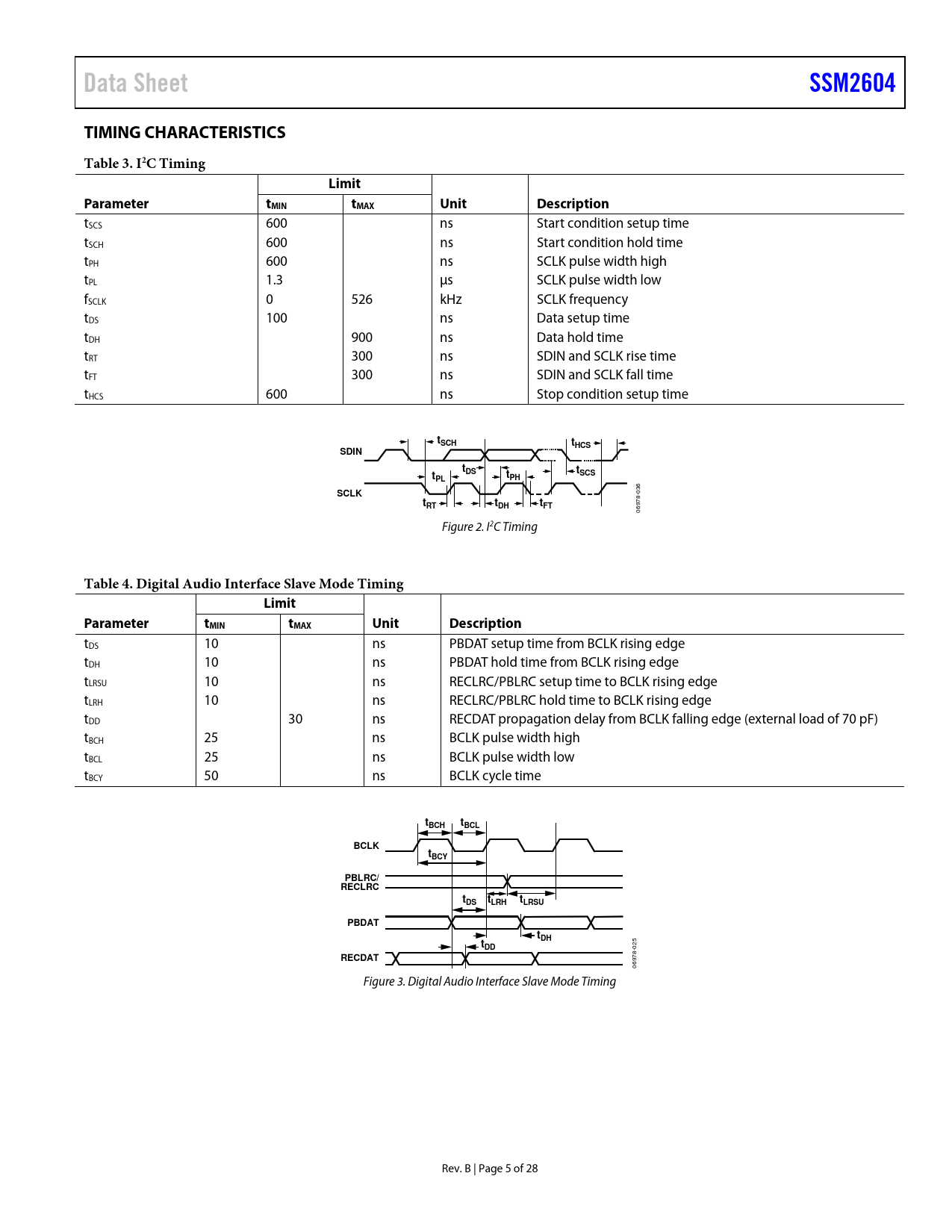 | Pages / Page | 28 / 5 — Data Sheet. SSM2604. TIMING CHARACTERISTICS. Table 3. I2C Timing. Limit. … |