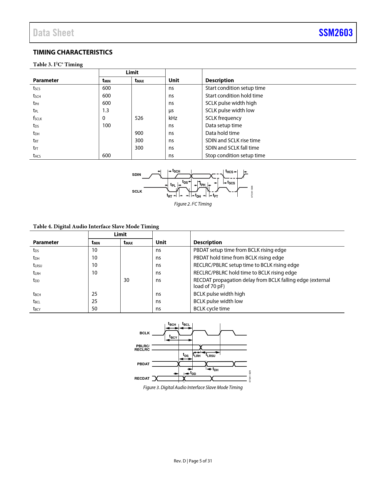 | Pages / Page | 31 / 5 — Data Sheet. SSM2603. TIMING CHARACTERISTICS. Table 3. I2C® Timing. Limit. … |