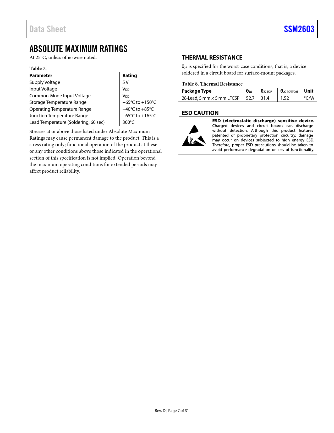 Pages / Page31 / 7 — Data Sheet. SSM2603. ABSOLUTE MAXIMUM RATINGS. THERMAL RESISTANCE. Table …