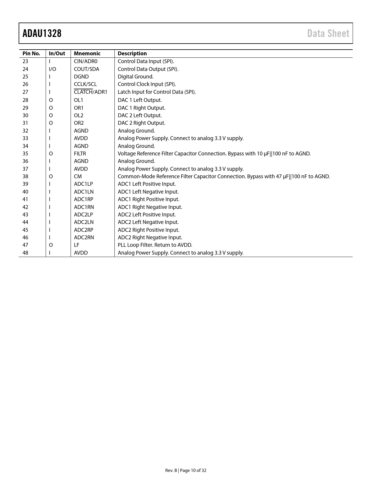 Pages / Page32 / 10 — ADAU1328. Data Sheet. Pin No. In/Out. Mnemonic. Description
