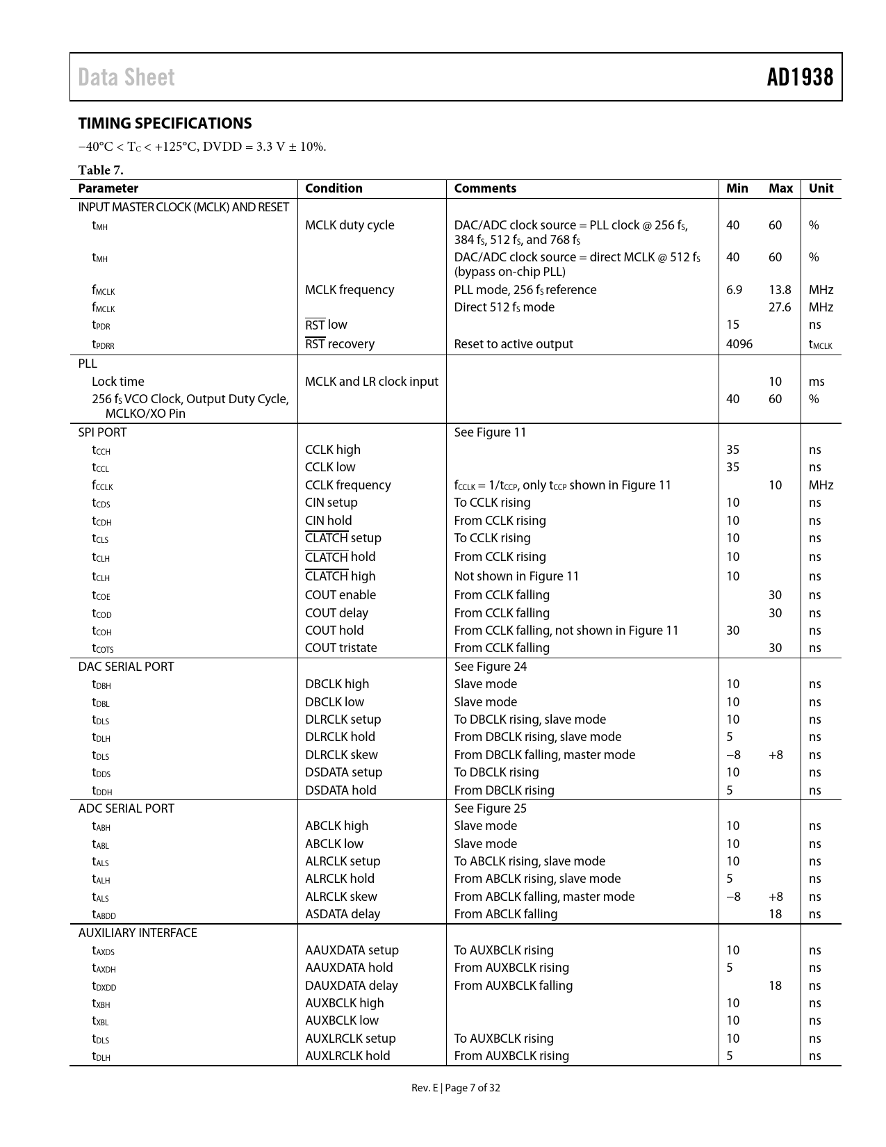 | Pages / Page | 32 / 7 — Data Sheet. AD1938. TIMING SPECIFICATIONS. Table 7. Parameter. Condition. … |