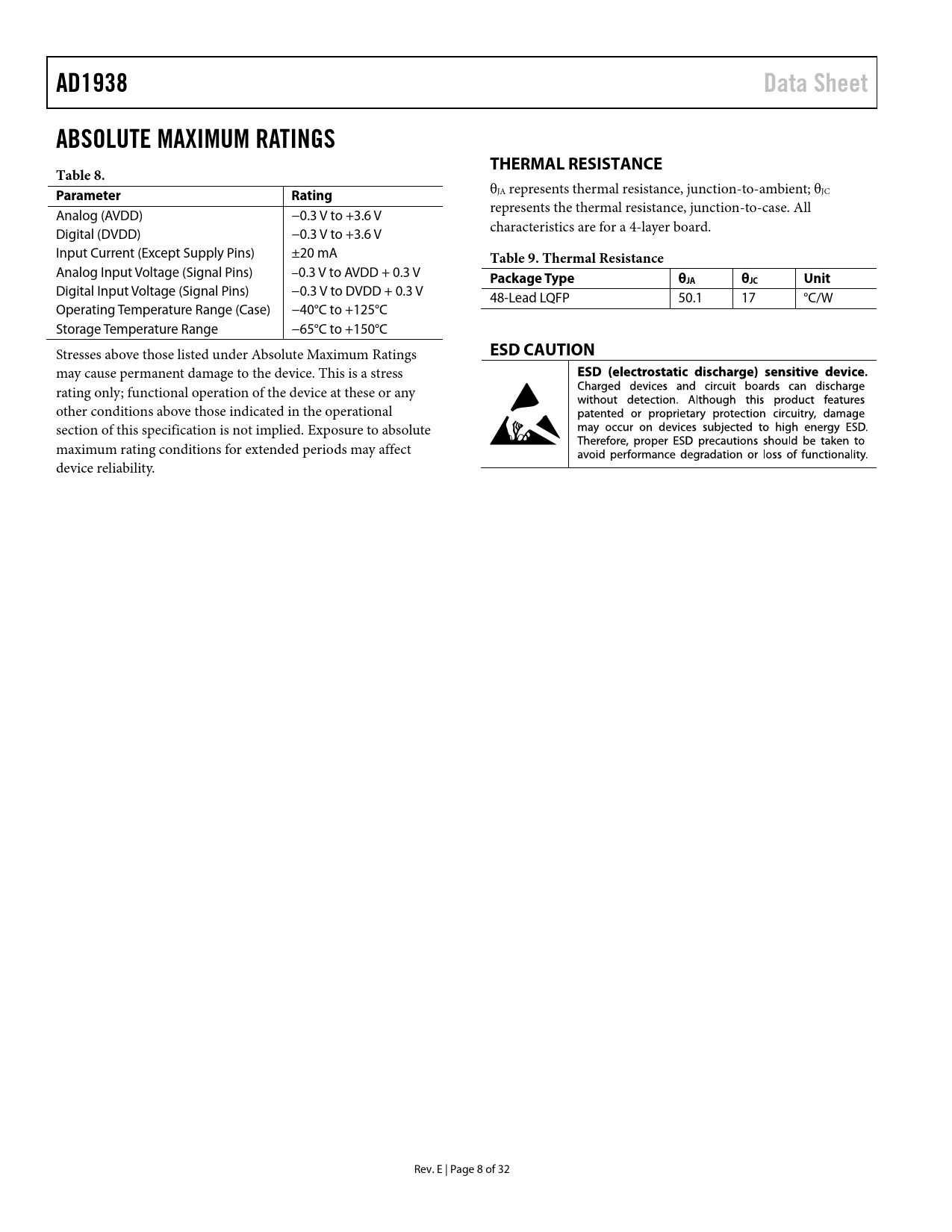 AD1938Data SheetABSOLUTE MAXIMUM RATINGSTHERMAL RESISTANCETable 8. θ Parameter Rating JA represents thermal resistance, junction-to-ambient; θJC represents the thermal resistance, junction-to-case. All Analog (AVDD) −0.3 V to +3.6 V characteristics are for a 4-layer board. Digital (DVDD) −0.3 V to +3.6 V Input Current (Except Supply Pins) ±20 mA Table 9. Thermal Resistance Analog Input Voltage (Signal Pins) –0.3 V to AVDD + 0.3 V Package TypeθJAθJC Unit Digital Input Voltage (Signal Pins) −0.3 V to DVDD + 0.3 V 48-Lead LQFP 50.1 17 °C/W Operating Temperature Range (Case) −40°C to +125°C Storage Temperature Range −65°C to +150°C Stresses above those listed under Absolute Maximum Ratings ESD CAUTION may cause permanent damage to the device. This is a stress rating only; functional operation of the device at these or any other conditions above those indicated in the operational section of this specification is not implied. Exposure to absolute maximum rating conditions for extended periods may affect device reliability. Rev. E | Page 8 of 32 Document Outline Features Applications General Description Functional Block Diagram Revision History Specifications Test Conditions Analog Performance Specifications Crystal Oscillator Specifications Digital Input/Output Specifications Power Supply Specifications Digital Filters Timing Specifications Absolute Maximum Ratings Thermal Resistance ESD Caution Pin Configuration and Function Descriptions Typical Performance Characteristics Theory of Operation Analog-to-Digital Converters (ADCs) Digital-to-Analog Converters (DACs) Clock Signals Reset and Power-Down Serial Control Port Power Supply and Voltage Reference Serial Data Ports—Data Format Time-Division Multiplexed (TDM) Modes Daisy-Chain Mode Control Registers Definitions PLL and Clock Control Registers DAC Control Registers ADC Control Registers Additional Modes Applications Circuits Outline Dimensions Ordering Guide Automotive Products