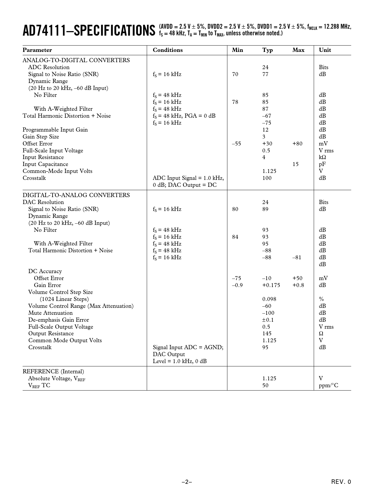 AD74111–SPECIFICATIONS (AVDD = 2.5 V ± 5%, DVDD2 = 2.5 V ± 5%, DVDD1 = 2.5 V ± 5%, fMCLK = 12.288 MHz,fS = 48 kHz, TA = TMIN to TMAX, unless otherwise noted.)ParameterConditionsMinTypMaxUnit ANALOG-TO-DIGITAL CONVERTERS ADC Resolution 24 Bits Signal to Noise Ratio (SNR) fS = 16 kHz 70 77 dB Dynamic Range (20 Hz to 20 kHz, –60 dB Input) No Filter fS = 48 kHz 85 dB fS = 16 kHz 78 85 dB With A-Weighted Filter fS = 48 kHz 87 dB Total Harmonic Distortion + Noise fS = 48 kHz, PGA = 0 dB –67 dB fS = 16 kHz –75 dB Programmable Input Gain 12 dB Gain Step Size 3 dB Offset Error –55 +30 +80 mV Full-Scale Input Voltage 0.5 V rms Input Resistance 4 kΩ Input Capacitance 15 pF Common-Mode Input Volts 1.125 V Crosstalk ADC Input Signal = 1.0 kHz, 100 dB 0 dB; DAC Output = DC DIGITAL-TO-ANALOG CONVERTERS DAC Resolution 24 Bits Signal to Noise Ratio (SNR) fS = 16 kHz 80 89 dB Dynamic Range (20 Hz to 20 kHz, –60 dB Input) No Filter fS = 48 kHz 93 dB fS = 16 kHz 84 93 dB With A-Weighted Filter fS = 48 kHz 95 dB Total Harmonic Distortion + Noise fS = 48 kHz –88 dB fS = 16 kHz –88 –81 dB dB DC Accuracy Offset Error –75 –10 +50 mV Gain Error –0.9 +0.175 +0.8 dB Volume Control Step Size (1024 Linear Steps) 0.098 % Volume Control Range (Max Attenuation) –60 dB Mute Attenuation –100 dB De-emphasis Gain Error ±0.1 dB Full-Scale Output Voltage 0.5 V rms Output Resistance 145 Ω Common Mode Output Volts 1.125 V Crosstalk Signal Input ADC = AGND; 95 dB DAC Output Level = 1.0 kHz, 0 dB REFERENCE (Internal) Absolute Voltage, VREF 1.125 V VREF TC 50 ppm/°C –2– REV. 0 Document Outline FEATURES FUNCTIONAL BLOCK DIAGRAM GENERAL DESCRIPTION SPECIFICATIONS TIMING CHARACTERISTICS ABSOLUTE MAXIMUM RATINGS TEMPERATURE RANGE ORDERING GUIDE PIN CONFIGURATION PIN FUNCTION DESCRIPTIONS Typical Performance Characteristics FUNCTIONAL DESCRIPTION General Description ADC Section ADC, CAPP, and CAPN Pins Peak Readback Decimator Section Input Signal Swing DAC Section Output Signal Swing Low Group Delay Reference Master Clocking Scheme Selecting Sample Rates Resetting the AD74111 Power Supplies and Grounds Accessing the Internal Registers Serial Port Serial Port Operating Modes Mixed Mode Data Mode Data-Word Length Selecting Master or Slave Mode Master Mode Operation Slave Mode Operation OUTLINE DIMENSIONS