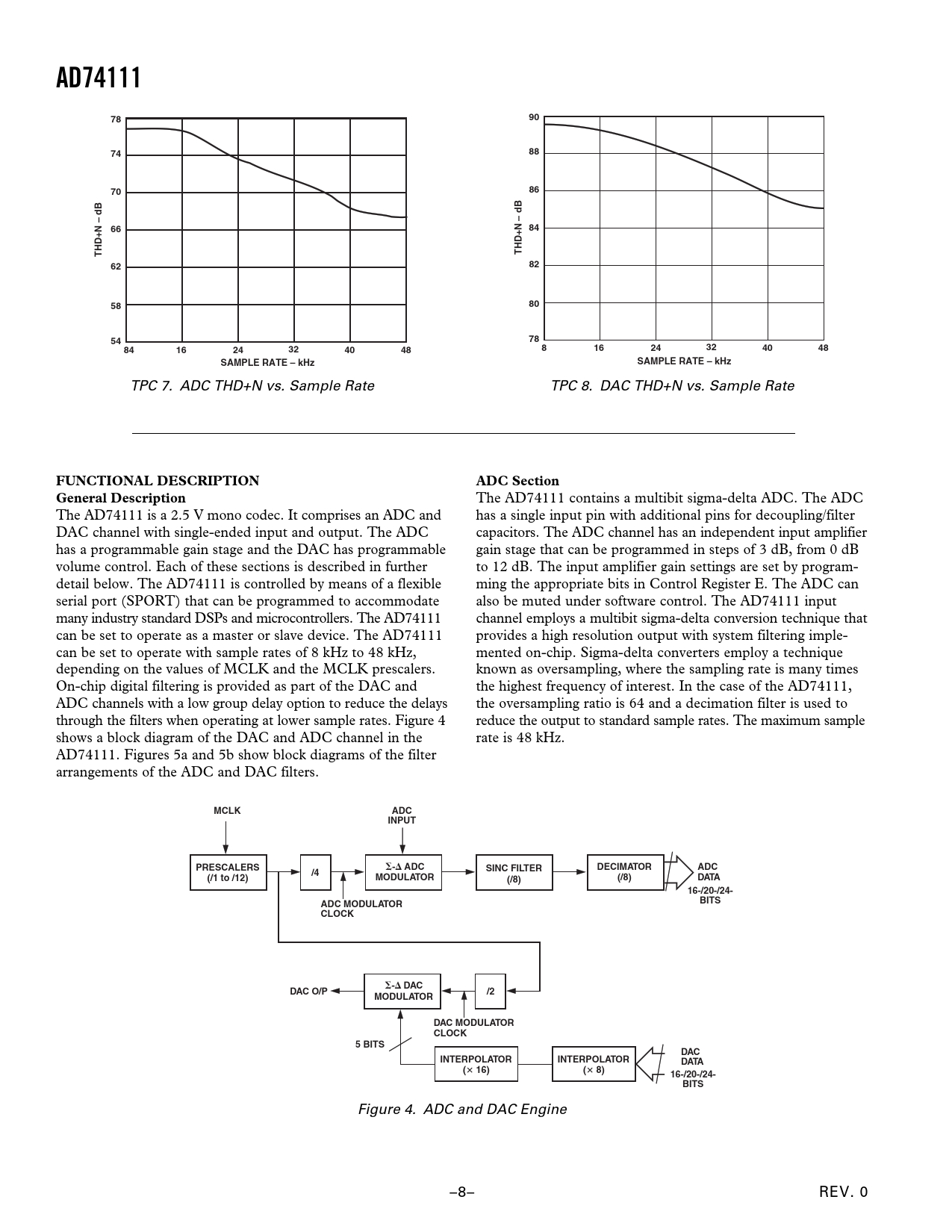 AD74111789074887086dB6684THD+N –THD+N – dB62825880547884162432404881624324048SAMPLE RATE – kHzSAMPLE RATE – kHz TPC 7. ADC THD+N vs. Sample Rate TPC 8. DAC THD+N vs. Sample Rate FUNCTIONAL DESCRIPTIONADC SectionGeneral Description The AD74111 contains a multibit sigma-delta ADC. The ADC The AD74111 is a 2.5 V mono codec. It comprises an ADC and has a single input pin with additional pins for decoupling/filter DAC channel with single-ended input and output. The ADC capacitors. The ADC channel has an independent input amplifier has a programmable gain stage and the DAC has programmable gain stage that can be programmed in steps of 3 dB, from 0 dB volume control. Each of these sections is described in further to 12 dB. The input amplifier gain settings are set by program- detail below. The AD74111 is controlled by means of a flexible ming the appropriate bits in Control Register E. The ADC can serial port (SPORT) that can be programmed to accommodate also be muted under software control. The AD74111 input many industry standard DSPs and microcontrollers. The AD74111 channel employs a multibit sigma-delta conversion technique that can be set to operate as a master or slave device. The AD74111 provides a high resolution output with system filtering imple- can be set to operate with sample rates of 8 kHz to 48 kHz, mented on-chip. Sigma-delta converters employ a technique depending on the values of MCLK and the MCLK prescalers. known as oversampling, where the sampling rate is many times On-chip digital filtering is provided as part of the DAC and the highest frequency of interest. In the case of the AD74111, ADC channels with a low group delay option to reduce the delays the oversampling ratio is 64 and a decimation filter is used to through the filters when operating at lower sample rates. Figure 4 reduce the output to standard sample rates. The maximum sample shows a block diagram of the DAC and ADC channel in the rate is 48 kHz. AD74111. Figures 5a and 5b show block diagrams of the filter arrangements of the ADC and DAC filters. MCLKADCINPUTPRESCALERS-ADCDECIMATORADC/4SINC FILTER(/1 to /12)MODULATOR(/8)(/8)DATA16-/20-/24-BITSADC MODULATOR CLOCK-DACDAC O/P/2MODULATORDAC MODULATOR CLOCK5 BITSDACINTERPOLATORINTERPOLATORDATA(16)(8)16-/20-/24-BITS Figure 4. ADC and DAC Engine –8– REV. 0 Document Outline FEATURES FUNCTIONAL BLOCK DIAGRAM GENERAL DESCRIPTION SPECIFICATIONS TIMING CHARACTERISTICS ABSOLUTE MAXIMUM RATINGS TEMPERATURE RANGE ORDERING GUIDE PIN CONFIGURATION PIN FUNCTION DESCRIPTIONS Typical Performance Characteristics FUNCTIONAL DESCRIPTION General Description ADC Section ADC, CAPP, and CAPN Pins Peak Readback Decimator Section Input Signal Swing DAC Section Output Signal Swing Low Group Delay Reference Master Clocking Scheme Selecting Sample Rates Resetting the AD74111 Power Supplies and Grounds Accessing the Internal Registers Serial Port Serial Port Operating Modes Mixed Mode Data Mode Data-Word Length Selecting Master or Slave Mode Master Mode Operation Slave Mode Operation OUTLINE DIMENSIONS