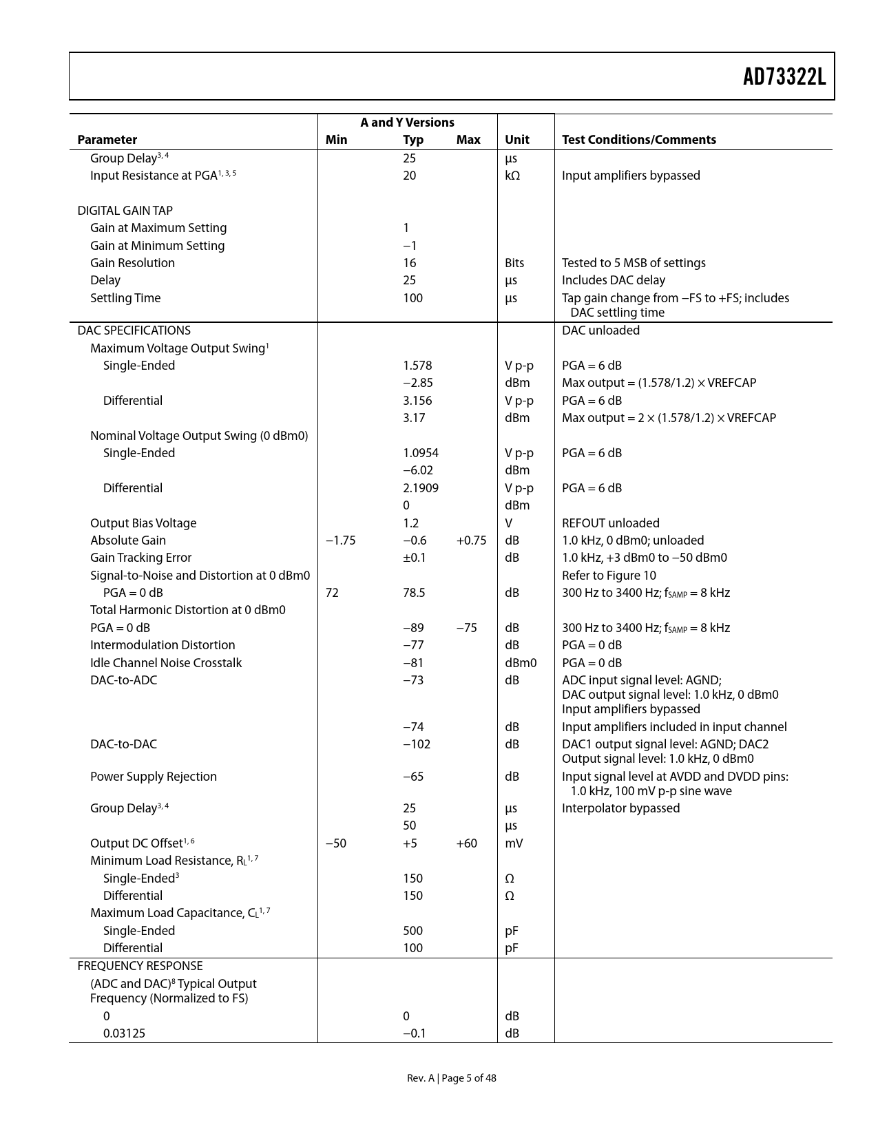 link to page 4 link to page 5 link to page 13 link to page 5 link to page 5 link to page 4 link to page 4 link to page 4 link to page 5 link to page 6 link to page 6 link to page 6 link to page 6 link to page 6 link to page 6 AD73322LAandYVersionsParameter MinTypMaxUnitTestConditions/Comments Group Delay3, 4 25 µs Input Resistance at PGA1, 3, 5 20 kΩ Input amplifiers bypassed DIGITAL GAIN TAP Gain at Maximum Setting 1 Gain at Minimum Setting −1 Gain Resolution 16 Bits Tested to 5 MSB of settings Delay 25 µs Includes DAC delay Settling Time 100 µs Tap gain change from −FS to +FS; includes DAC settling time DAC SPECIFICATIONS DAC unloaded Maximum Voltage Output Swing1 Single-Ended 1.578 V p-p PGA = 6 dB −2.85 dBm Max output = (1.578/1.2) × VREFCAP Differential 3.156 V p-p PGA = 6 dB 3.17 dBm Max output = 2 × (1.578/1.2) × VREFCAP Nominal Voltage Output Swing (0 dBm0) Single-Ended 1.0954 V p-p PGA = 6 dB −6.02 dBm Differential 2.1909 V p-p PGA = 6 dB 0 dBm Output Bias Voltage 1.2 V REFOUT unloaded Absolute Gain −1.75 −0.6 +0.75 dB 1.0 kHz, 0 dBm0; unloaded Gain Tracking Error ±0.1 dB 1.0 kHz, +3 dBm0 to −50 dBm0 Signal-to-Noise and Distortion at 0 dBm0 Refer to Figure 10 PGA = 0 dB 72 78.5 dB 300 Hz to 3400 Hz; fSAMP = 8 kHz Total Harmonic Distortion at 0 dBm0 PGA = 0 dB −89 −75 dB 300 Hz to 3400 Hz; fSAMP = 8 kHz Intermodulation Distortion −77 dB PGA = 0 dB Idle Channel Noise Crosstalk −81 dBm0 PGA = 0 dB DAC-to-ADC −73 dB ADC input signal level: AGND; DAC output signal level: 1.0 kHz, 0 dBm0 Input amplifiers bypassed −74 dB Input amplifiers included in input channel DAC-to-DAC −102 dB DAC1 output signal level: AGND; DAC2 Output signal level: 1.0 kHz, 0 dBm0 Power Supply Rejection −65 dB Input signal level at AVDD and DVDD pins: 1.0 kHz, 100 mV p-p sine wave Group Delay3, 4 25 µs Interpolator bypassed 50 µs Output DC Offset1, 6 −50 +5 +60 mV Minimum Load Resistance, R 1, 7 L Single-Ended3 150 Ω Differential 150 Ω Maximum Load Capacitance, C 1, 7 L Single-Ended 500 pF Differential 100 pF FREQUENCY RESPONSE (ADC and DAC)8 Typical Output Frequency (Normalized to FS) 0 0 dB 0.03125 −0.1 dB Rev. A | Page 5 of 48 Document Outline FEATURES APPLICATIONS GENERAL DESCRIPTION FUNCTIONAL BLOCK DIAGRAM SPECIFICATIONS CURRENT SUMMARY SIGNAL RANGES TIMING CHARACTERISTICS TIMING DIAGRAMS ABSOLUTE MAXIMUM RATINGS ESD CAUTION PIN CONFIGURATIONS AND FUNCTION DESCRIPTIONS TERMINOLOGY ABBREVIATIONS TYPICAL PERFORMANCE CHARACTERISTICS AND FUNCTIONAL BLOCK DIA FUNCTIONAL DESCRIPTIONS ENCODER CHANNELS PROGRAMMABLE GAIN AMPLIFIER ADC ANALOG SIGMA-DELTA MODULATOR DECIMATION FILTER ADC CODING DECODER CHANNEL DAC CODING INTERPOLATION FILTER ANALOG SMOOTHING FILTER AND PGA DIFFERENTIAL OUTPUT AMPLIFIERS VOLTAGE REFERENCE ANALOG AND DIGITAL GAIN TAPS DIGITAL GAIN TAP SERIAL PORT (SPORT) SPORT OVERVIEW SPORT REGISTER MAPS MASTER CLOCK DIVIDER SERIAL CLOCK RATE DIVIDER SAMPLE RATE DIVIDER DAC ADVANCE REGISTER CONTROL REGISTER A CONTROL REGISTER B CONTROL REGISTER C CONTROL REGISTER D CONTROL REGISTER E CONTROL REGISTER F CONTROL REGISTER G CONTROL REGISTER H OPERATION RESETTING THE AD73322L POWER MANAGEMENT OPERATING MODES PROGRAM (CONTROL) MODE DATA MODE MIXED PROGRAM/DATA MODE DIGITAL LOOP-BACK MODE SPORT LOOP-BACK MODE ANALOG LOOP-BACK MODE INTERFACING CASCADE OPERATION PERFORMANCE ENCODER SECTION ENCODER GROUP DELAY DECODER SECTION ON-CHIP FILTERING DECODER GROUP DELAY DESIGN CONSIDERATIONS ANALOG INPUTS INTERFACING TO AN ELECTRET MICROPHONE ANALOG OUTPUT DIFFERENTIAL-TO-SINGLE-ENDED OUTPUT DIGITAL INTERFACING CASCADE OPERATION GROUNDING AND LAYOUT DSP PROGRAMMING CONSIDERATIONS DSP SPORT CONFIGURATION DSP SPORT INTERRUPTS DSP SOFTWARE CONSIDERATIONS WHEN INTERFACING TO THE AD73322L OPERATING MODE MIXED-MODE OPERATION INTERRUPTS INITIALIZATION RUNNING THE AD73322L WITH ADCS OR DACS IN POWER-DOWN DAC TIMING CONTROL EXAMPLE CONFIGURING AN AD73322L TO OPERATE IN DATA MODE CONFIGURING AN AD73322L TO OPERATE IN MIXED MODE OUTLINE DIMENSIONS ORDERING GUIDE