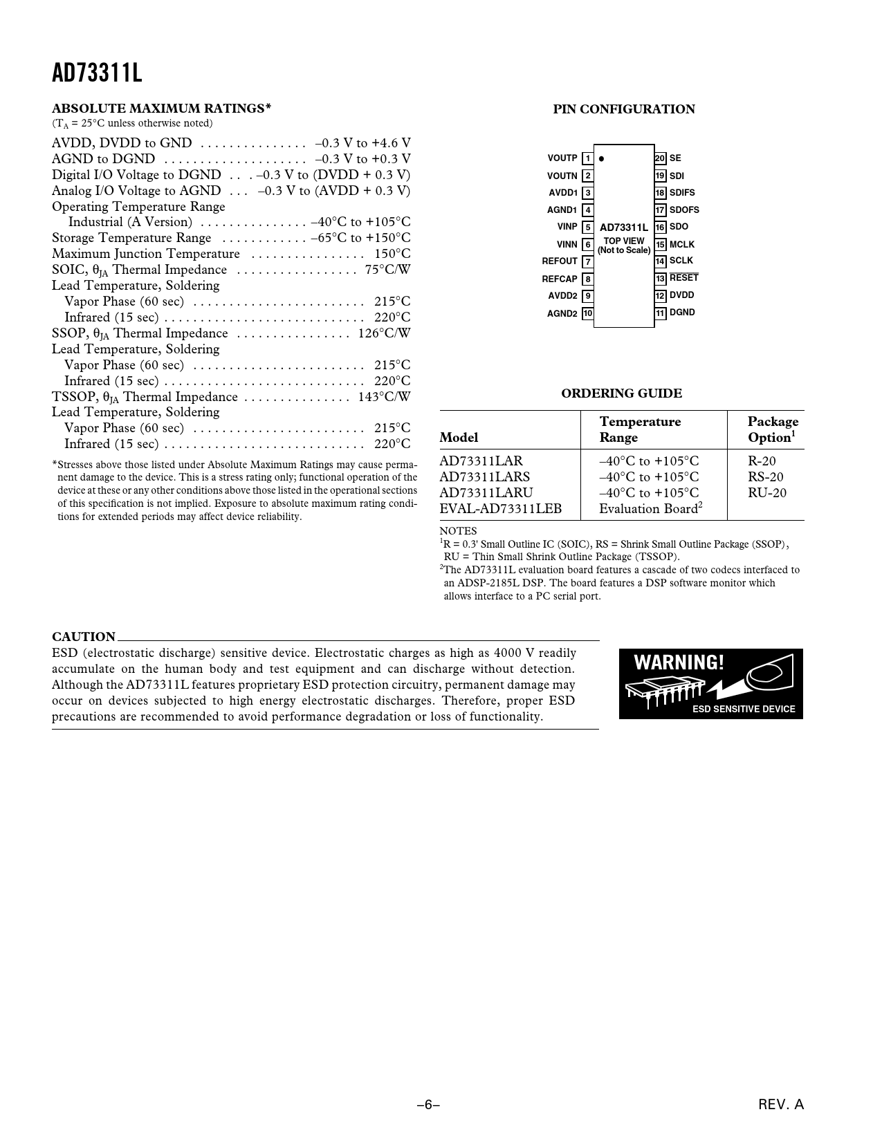 AD73311LABSOLUTE MAXIMUM RATINGS*PIN CONFIGURATION (TA = 25°C unless otherwise noted) AVDD, DVDD to GND . –0.3 V to +4.6 V AGND to DGND . –0.3 V to +0.3 V VOUTP120 SE Digital I/O Voltage to DGND . –0.3 V to (DVDD + 0.3 V) VOUTN219 SDI Analog I/O Voltage to AGND . –0.3 V to (AVDD + 0.3 V) AVDD1 318 SDIFS Operating Temperature Range AGND1417 SDOFS Industrial (A Version) . –40°C to +105°C VINP5AD73311L 16 SDO Storage Temperature Range . –65°C to +150°C VINN6TOP VIEW15 MCLK Maximum Junction Temperature . 150°C (Not to Scale)REFOUT714 SCLK SOIC, θJA Thermal Impedance . 75°C/W REFCAP813 RESET Lead Temperature, Soldering DVDD Vapor Phase (60 sec) . 215°C AVDD2912 Infrared (15 sec) . 220°C AGND2 1011 DGND SSOP, θJA Thermal Impedance . 126°C/W Lead Temperature, Soldering Vapor Phase (60 sec) . 215°C Infrared (15 sec) . 220°C TSSOP, θ ORDERING GUIDE JA Thermal Impedance . 143°C/W Lead Temperature, Soldering TemperaturePackage Vapor Phase (60 sec) . 215°C ModelRangeOption1 Infrared (15 sec) . 220°C *Stresses above those listed under Absolute Maximum Ratings may cause perma- AD73311LAR –40°C to +105°C R-20 nent damage to the device. This is a stress rating only; functional operation of the AD73311LARS –40°C to +105°C RS-20 device at these or any other conditions above those listed in the operational sections AD73311LARU –40°C to +105°C RU-20 of this specification is not implied. Exposure to absolute maximum rating condi- EVAL-AD73311LEB Evaluation Board2 tions for extended periods may affect device reliability. NOTES 1R = 0.3' Small Outline IC (SOIC), RS = Shrink Small Outline Package (SSOP), RU = Thin Small Shrink Outline Package (TSSOP). 2The AD73311L evaluation board features a cascade of two codecs interfaced to an ADSP-2185L DSP. The board features a DSP software monitor which allows interface to a PC serial port. CAUTION ESD (electrostatic discharge) sensitive device. Electrostatic charges as high as 4000 V readily WARNING! accumulate on the human body and test equipment and can discharge without detection. Although the AD73311L features proprietary ESD protection circuitry, permanent damage may occur on devices subjected to high energy electrostatic discharges. Therefore, proper ESD ESD SENSITIVE DEVICE precautions are recommended to avoid performance degradation or loss of functionality. –6– REV. A