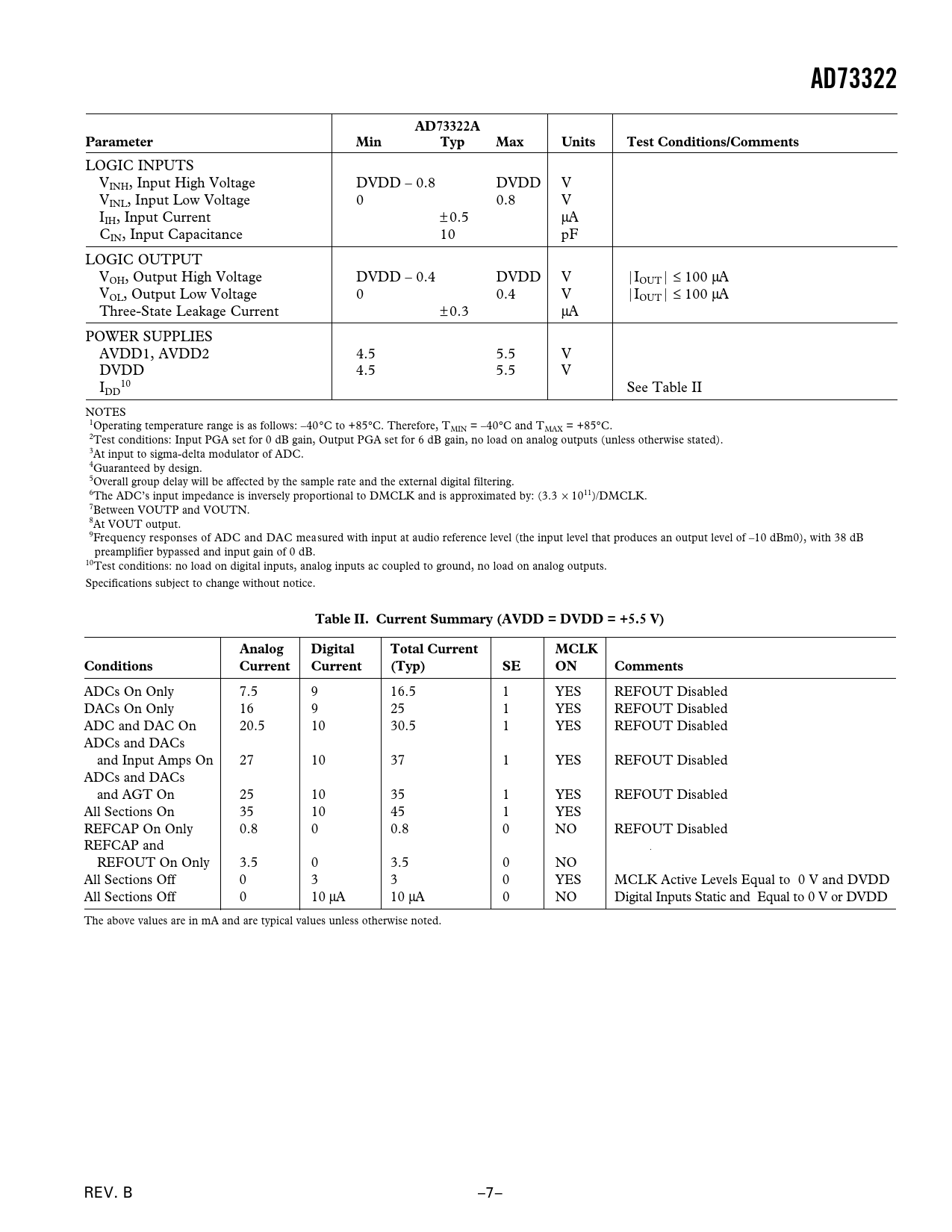 AD73322. AD73322A. Parameter. Min. Typ. Max. Units. Test Conditions/Comments. Table II. Current Summary (AVDD = DVDD = +5.5 V). Analog