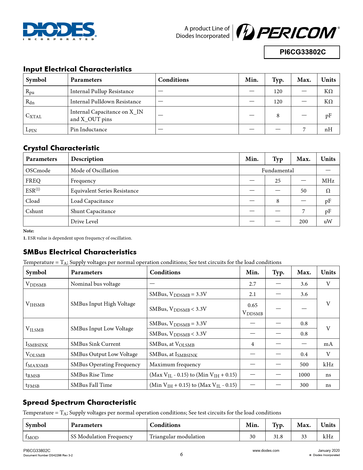 A product Line of Diodes Incorporated PI6CG33802CInput Electrical CharacteristicsSymbolParametersConditionsMin.Typ.Max.Units Rpu Internal Pullup Resistance — — 120 — KΩ Rdn Internal Pulldown Resistance — — 120 — KΩ C Internal Capacitance on X_IN XTAL and X_OUT pins — — 8 — pF LPIN Pin Inductance — — — 7 nH Crystal CharacteristicParametersDescriptionMin.TypMax.Units OSCmode Mode of Oscillation Fundamental — FREQ Frequency — 25 — MHz ESR(1) Equivalent Series Resistance — — 50 Ω Cload Load Capacitance — 8 — pF Cshunt Shunt Capacitance — — 7 pF Drive Level — — 200 uW Note: 1. ESR value is dependent upon frequency of oscillation. SMBus Electrical Characteristics Temperature = TA; Supply voltages per normal operation conditions; See test circuits for the load conditions SymbolParametersConditionsMin.Typ.Max.Units VDDSMB Nominal bus voltage — 2.7 — 3.6 V SMBus, VDDSMB = 3.3V 2.1 — 3.6 VIHSMB SMBus Input High Voltage V SMBus, VDDSMB < 3.3V 0.65 V — — DDSMB SMBus, V V DDSMB = 3.3V — — 0.8 ILSMB SMBus Input Low Voltage V SMBus, VDDSMB < 3.3V — — 0.8 ISMBSINK SMBus Sink Current SMBus, at VOLSMB 4 — — mA VOLSMB SMBus Output Low Voltage SMBus, at ISMBSINK — — 0.4 V fMAXSMB SMBus Operating Frequency Maximum frequency — — 500 kHz tRMSB SMBus Rise Time (Max VIL - 0.15) to (Min VIH + 0.15) — — 1000 ns tFMSB SMBus Fall Time (Min VIH + 0.15) to (Max VIL - 0.15) — — 300 ns Spread Spectrum Characteristic Temperature = TA; Supply voltages per normal operation conditions; See test circuits for the load conditions SymbolParametersConditionsMin.Typ.Max.Units fMOD SS Modulation Frequency Triangular modulation 30 31.8 33 kHz PI6CG33802C www.diodes.com January 2020 Document Number DS42298 Rev 3-2 6 Diodes Incorporated