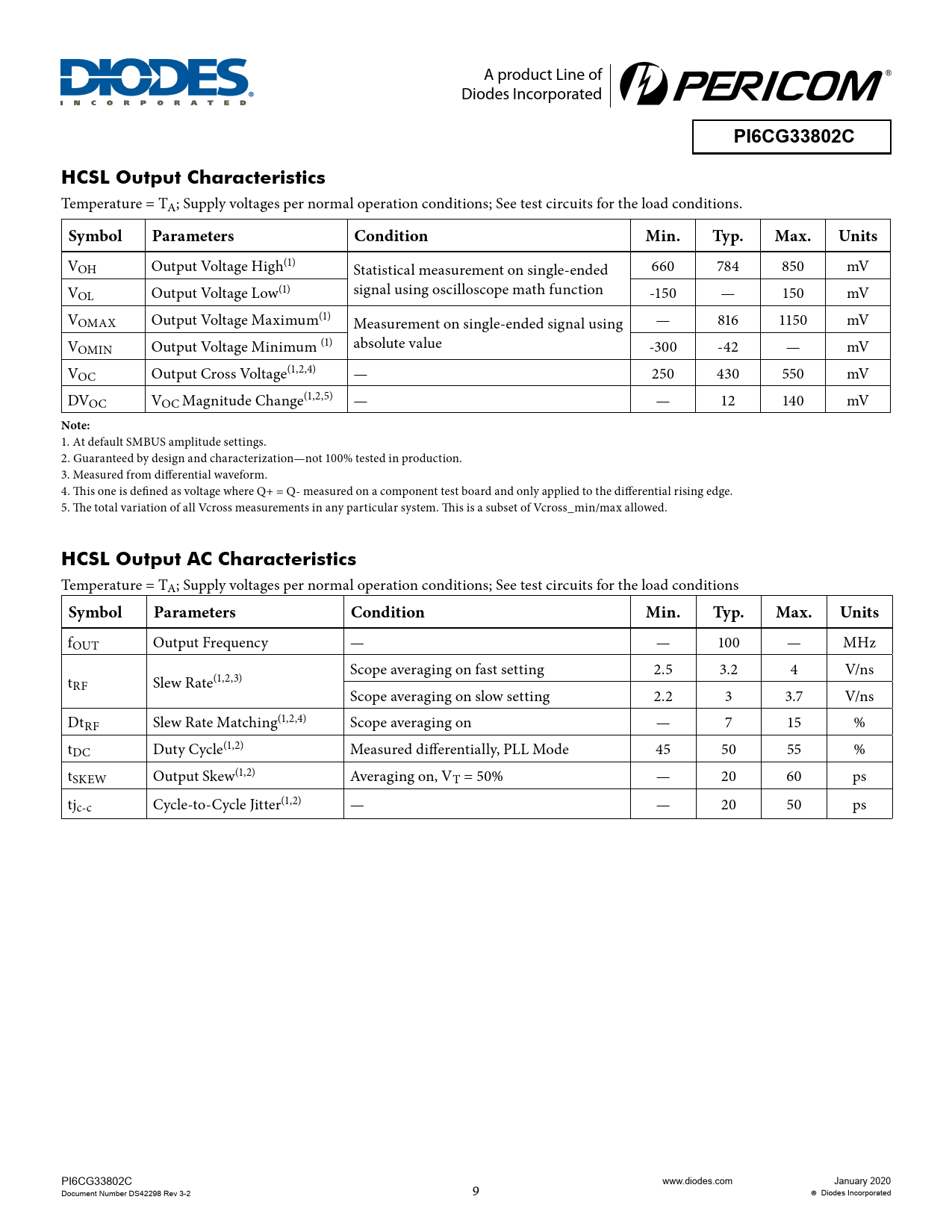 A product Line of Diodes Incorporated PI6CG33802CHCSL Output Characteristics Temperature = TA; Supply voltages per normal operation conditions; See test circuits for the load conditions. SymbolParametersConditionMin.Typ.Max.Units VOH Output Voltage High(1) Statistical measurement on single-ended 660 784 850 mV V signal using oscilloscope math function OL Output Voltage Low(1) -150 — 150 mV VOMAX Output Voltage Maximum(1) Measurement on single-ended signal using — 816 1150 mV V absolute value OMIN Output Voltage Minimum (1) -300 -42 — mV VOC Output Cross Voltage(1,2,4) — 250 430 550 mV DVOC VOC Magnitude Change(1,2,5) — — 12 140 mV Note: 1. At default SMBUS amplitude settings. 2. Guaranteed by design and characterization—not 100% tested in production. 3. Measured from differential waveform. 4. This one is defined as voltage where Q+ = Q- measured on a component test board and only applied to the differential rising edge. 5. The total variation of all Vcross measurements in any particular system. This is a subset of Vcross_min/max allowed. HCSL Output AC Characteristics Temperature = TA; Supply voltages per normal operation conditions; See test circuits for the load conditions SymbolParametersConditionMin.Typ.Max.Units fOUT Output Frequency — — 100 — MHz Scope averaging on fast setting 2.5 3.2 4 V/ns tRF Slew Rate(1,2,3) Scope averaging on slow setting 2.2 3 3.7 V/ns DtRF Slew Rate Matching(1,2,4) Scope averaging on — 7 15 % tDC Duty Cycle(1,2) Measured differentially, PLL Mode 45 50 55 % tSKEW Output Skew(1,2) Averaging on, VT = 50% — 20 60 ps tjc-c Cycle-to-Cycle Jitter(1,2) — — 20 50 ps PI6CG33802C www.diodes.com January 2020 Document Number DS42298 Rev 3-2 9 Diodes Incorporated