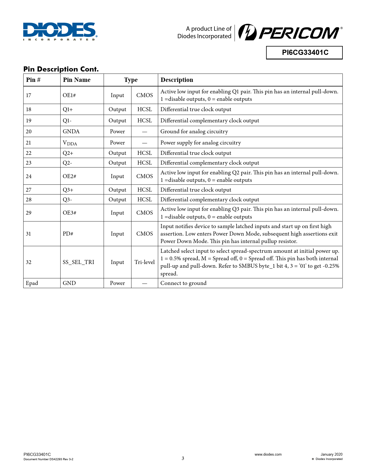A product Line of Diodes Incorporated PI6CG33401CPin Description Cont.Pin #Pin NameTypeDescription 17 OE1# Input CMOS Active low input for enabling Q1 pair. This pin has an internal pull-down. 1 =disable outputs, 0 = enable outputs 18 Q1+ Output HCSL Differential true clock output 19 Q1- Output HCSL Differential complementary clock output 20 GNDA Power — Ground for analog circuitry 21 VDDA Power — Power supply for analog circuitry 22 Q2+ Output HCSL Differential true clock output 23 Q2- Output HCSL Differential complementary clock output 24 OE2# Input CMOS Active low input for enabling Q2 pair. This pin has an internal pull-down. 1 =disable outputs, 0 = enable outputs 27 Q3+ Output HCSL Differential true clock output 28 Q3- Output HCSL Differential complementary clock output 29 OE3# Input CMOS Active low input for enabling Q3 pair. This pin has an internal pull-down. 1 =disable outputs, 0 = enable outputs Input notifies device to sample latched inputs and start up on first high 31 PD# Input CMOS assertion. Low enters Power Down Mode, subsequent high assertions exit Power Down Mode. This pin has internal pullup resistor. Latched select input to select spread-spectrum amount at initial power up. 32 SS_SEL_TRI Input Tri-level 1 = 0.5% spread, M = Spread off, 0 = Spread off. This pin has both internal pull-up and pull-down. Refer to SMBUS byte_1 bit 4, 3 = '01' to get -0.25% spread. Epad GND Power — Connect to ground PI6CG33401C www.diodes.com January 2020 Document Number DS42293 Rev 3-2 3 Diodes Incorporated