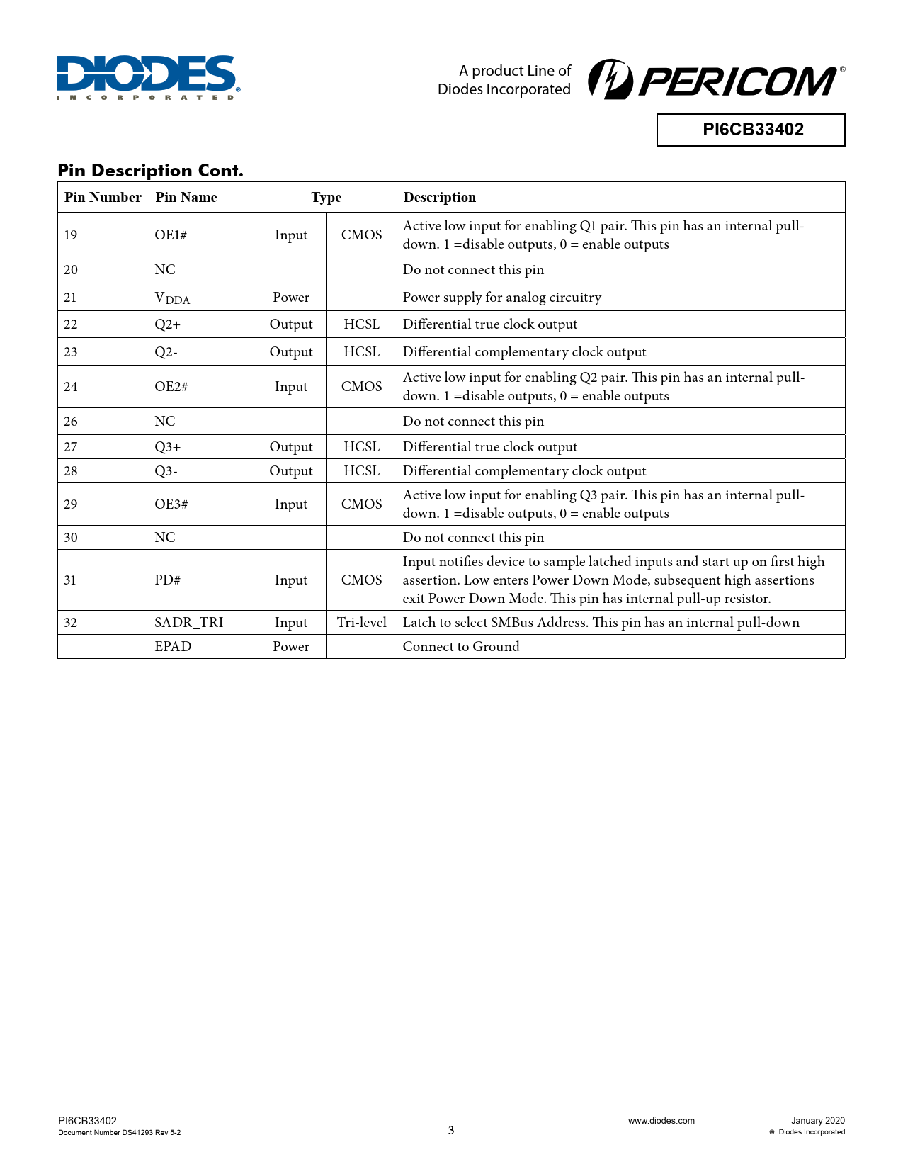 A product Line of Diodes Incorporated PI6CB33402Pin Description Cont.Pin Number Pin NameTypeDescription 19 OE1# Input CMOS Active low input for enabling Q1 pair. This pin has an internal pull- down. 1 =disable outputs, 0 = enable outputs 20 NC Do not connect this pin 21 VDDA Power Power supply for analog circuitry 22 Q2+ Output HCSL Differential true clock output 23 Q2- Output HCSL Differential complementary clock output 24 OE2# Input CMOS Active low input for enabling Q2 pair. This pin has an internal pull- down. 1 =disable outputs, 0 = enable outputs 26 NC Do not connect this pin 27 Q3+ Output HCSL Differential true clock output 28 Q3- Output HCSL Differential complementary clock output 29 OE3# Input CMOS Active low input for enabling Q3 pair. This pin has an internal pull- down. 1 =disable outputs, 0 = enable outputs 30 NC Do not connect this pin Input notifies device to sample latched inputs and start up on first high 31 PD# Input CMOS assertion. Low enters Power Down Mode, subsequent high assertions exit Power Down Mode. This pin has internal pull-up resistor. 32 SADR_TRI Input Tri-level Latch to select SMBus Address. This pin has an internal pull-down EPAD Power Connect to Ground PI6CB33402 www.diodes.com January 2020 Document Number DS41293 Rev 5-2 3 Diodes Incorporated