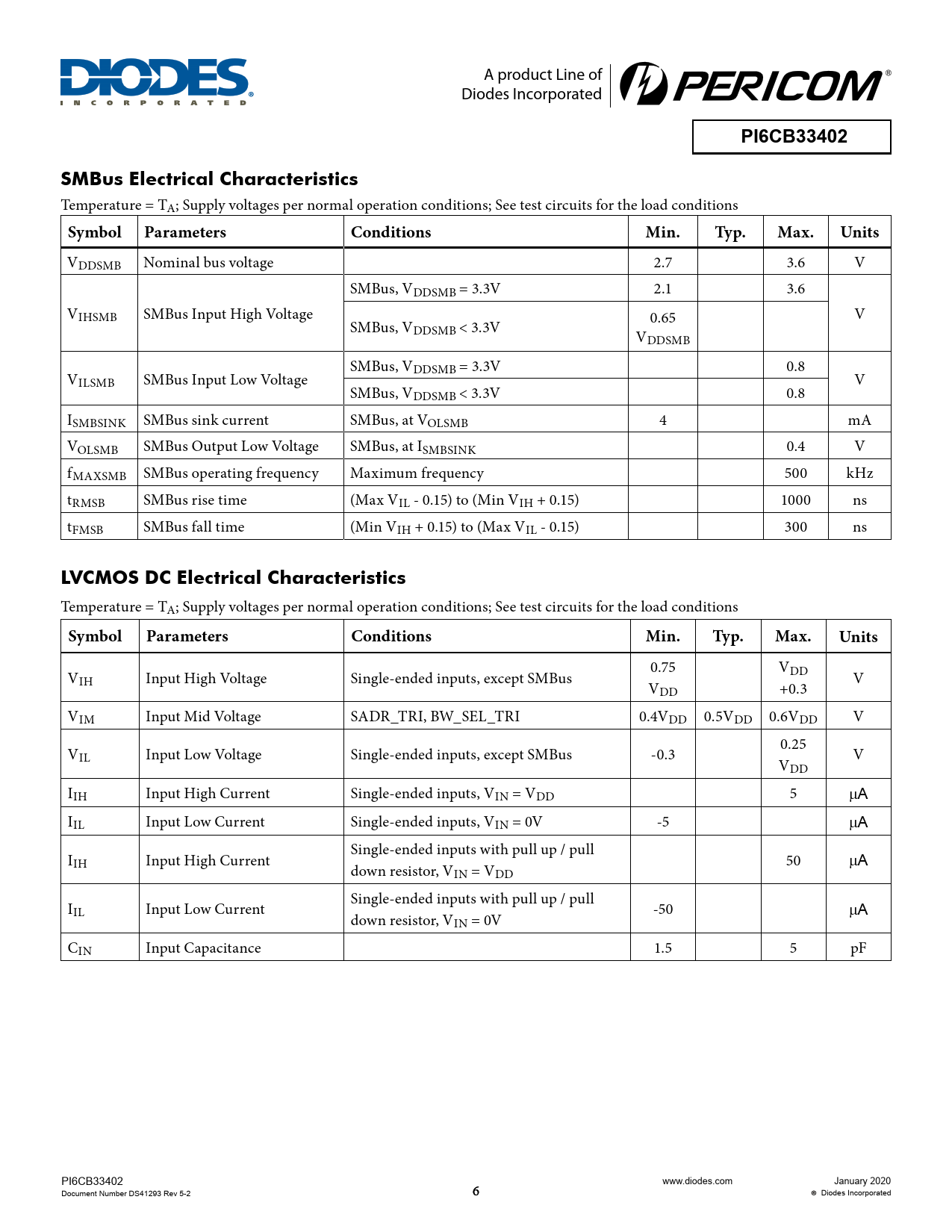 PI6CB33402. SMBus Electrical Characteristics. Symbol Parameters. Conditions. Min. Typ. Max. Units. LVCMOS DC Electrical Characteristics