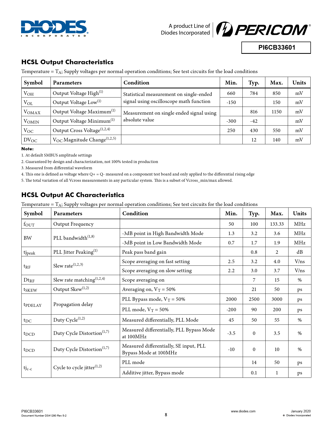 Pages / Page20 / 8 — PI6CB33601. HCSL Output Characteristics. Symbol. Parameters. Condition. …