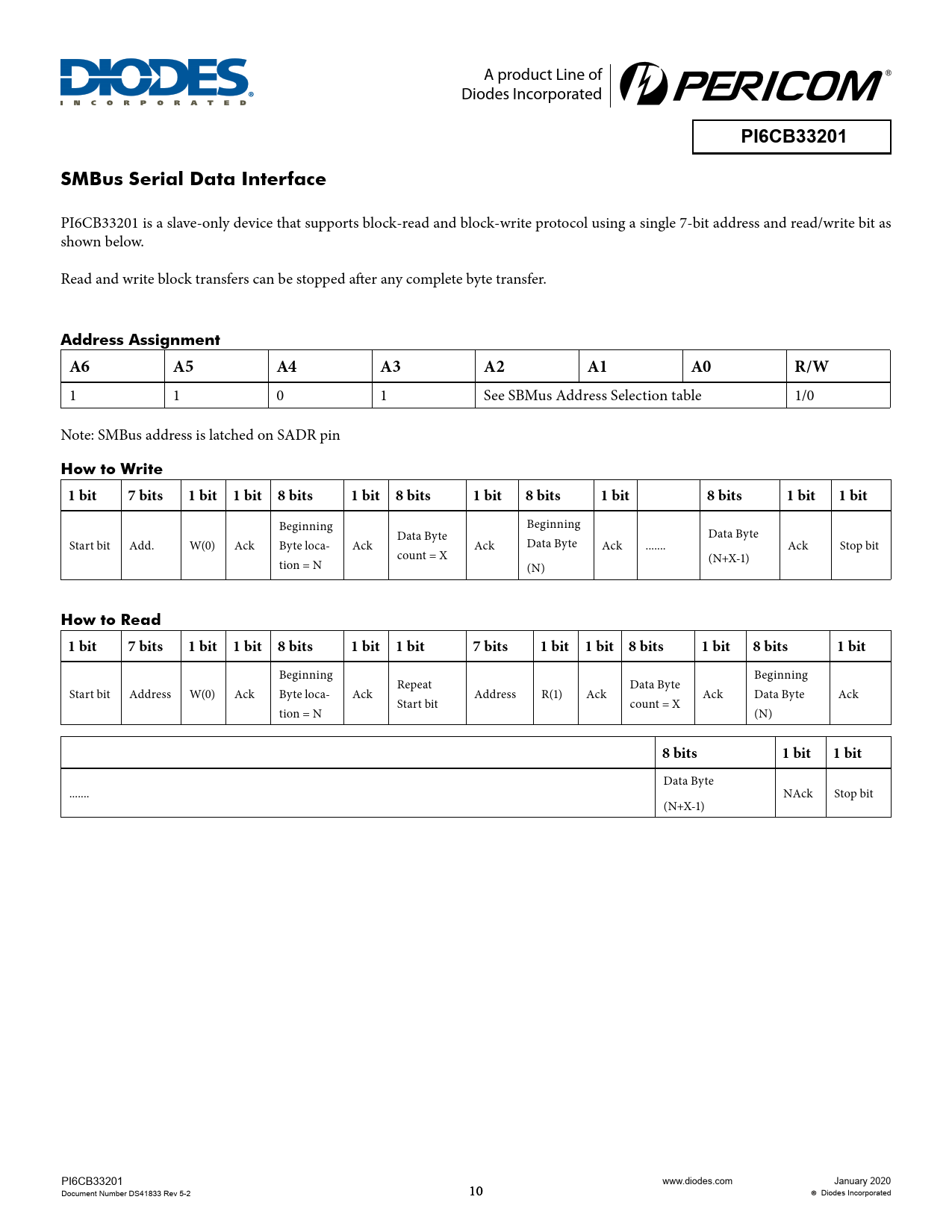PI6CB33201. SMBus Serial Data Interface. Address Assignment. R/W. How to Write. 1 bit. 7 bits. 1 bit 1 bit 8 bits. 1 bit 8 bits. 8 bits