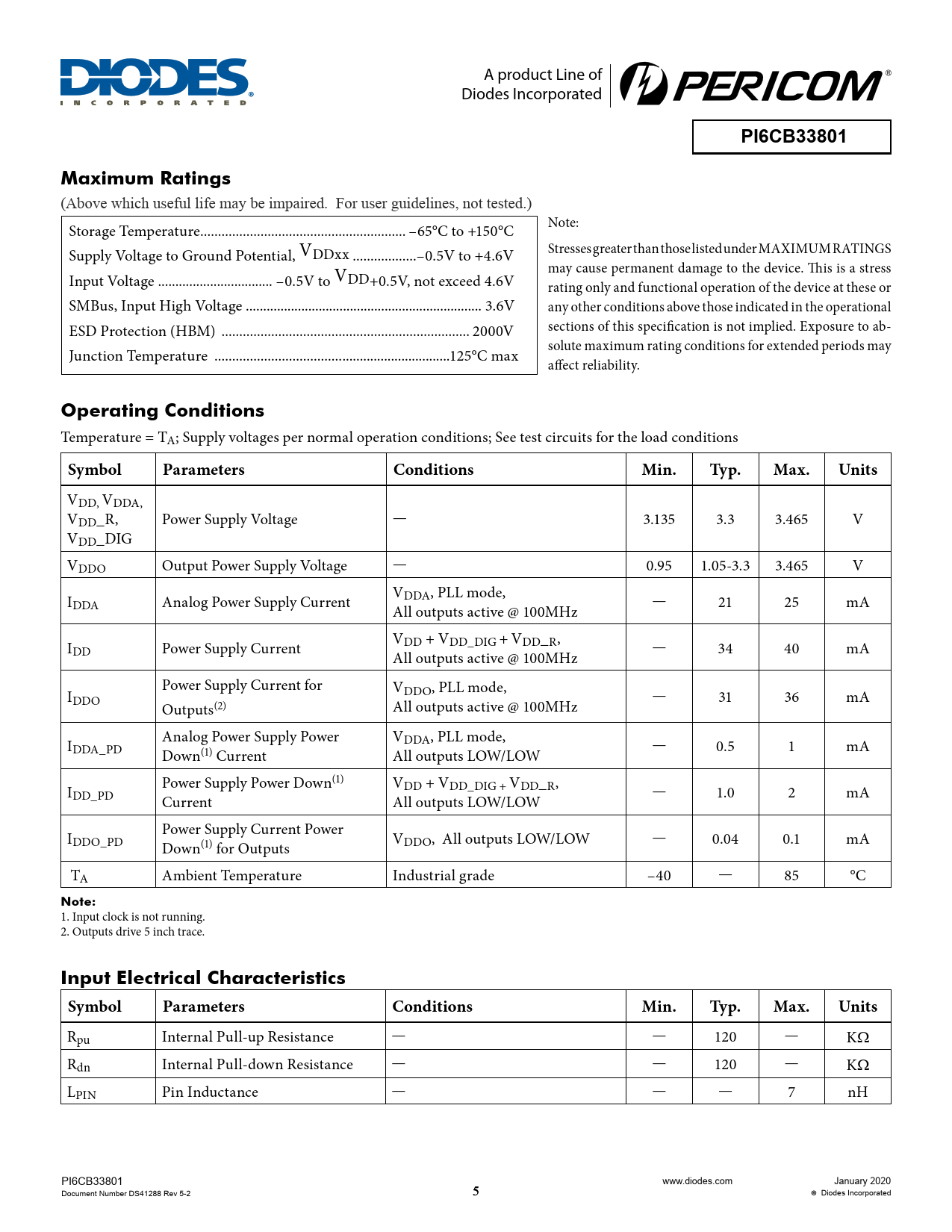 PI6CB33801. Maximum Ratings. Operating Conditions. Symbol. Parameters. Conditions. Min. Typ. Max. Units. Note: