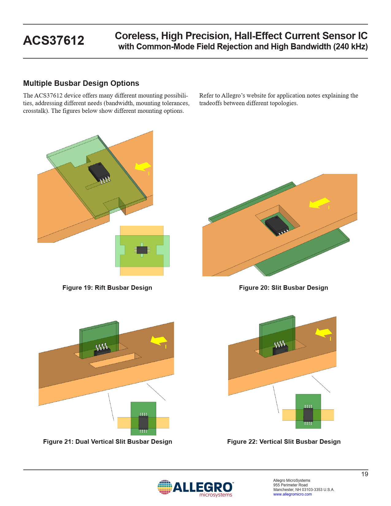 Coreless, High Precision, Hall-Effect Current Sensor ICACS37612with Common-Mode Field Rejection and High Bandwidth (240 kHz)Multiple Busbar Design Options The ACS37612 device offers many different mounting possibili- Refer to Allegro’s website for application notes explaining the ties, addressing different needs (bandwidth, mounting tolerances, tradeoffs between different topologies. crosstalk). The figures below show different mounting options. Figure 19: Rift Busbar DesignFigure 20: Slit Busbar DesignFigure 21: Dual Vertical Slit Busbar DesignFigure 22: Vertical Slit Busbar Design 19 Allegro MicroSystems 955 Perimeter Road Manchester, NH 03103-3353 U.S.A. www.allegromicro.com