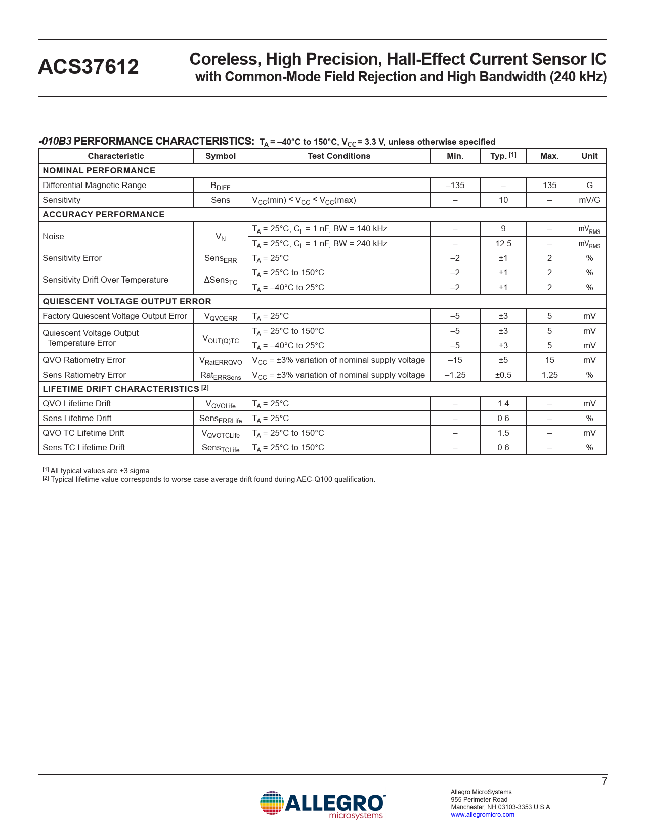 Coreless, High Precision, Hall-Effect Current Sensor IC ACS37612 with Common-Mode Field Rejection and High Bandwidth (240 kHz) -010B3 PERFORMANCE CHARACTERISTICS: TA = –40°C to 150°C, VCC = 3.3 V, unless otherwise specified Characteristic Symbol Test Conditions Min. Typ. [1] Max. Unit NOMINAL PERFORMANCE