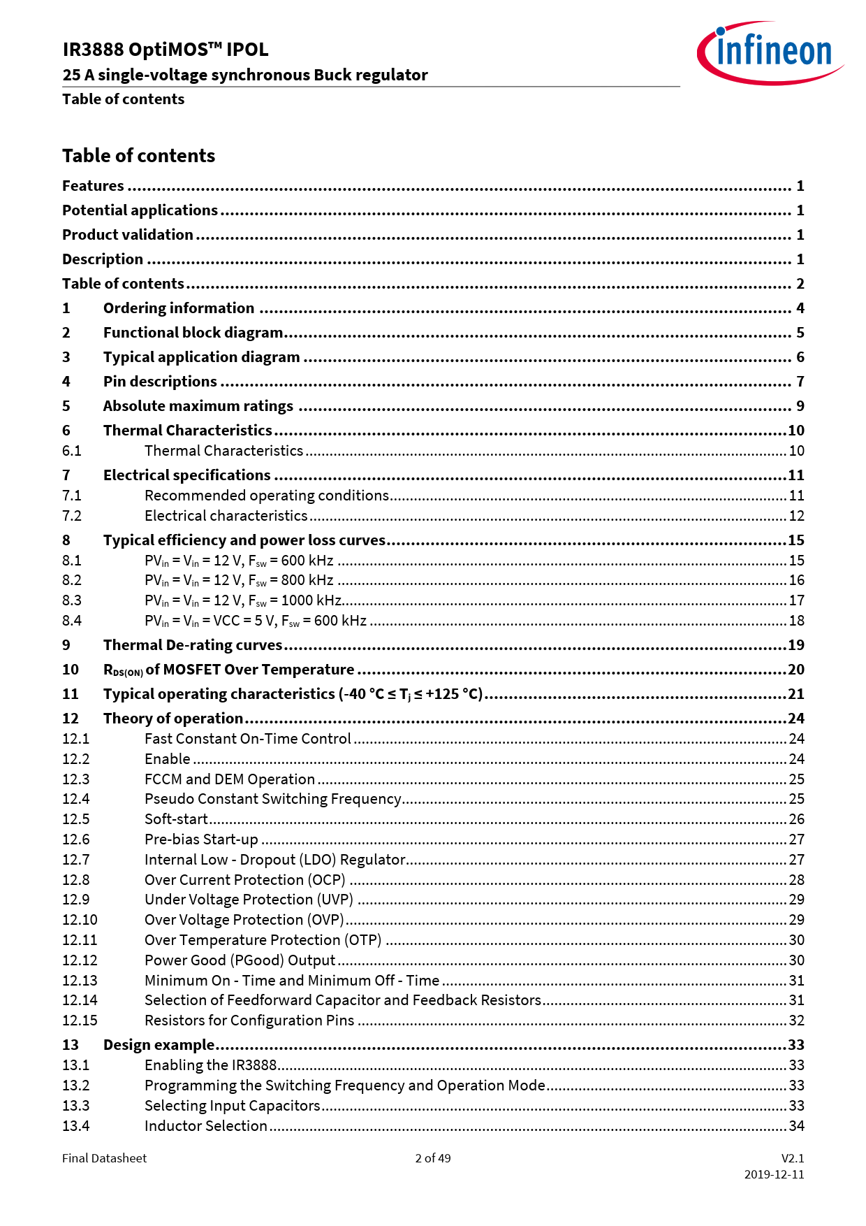 link to page 1 link to page 1 link to page 1 link to page 1 link to page 2 link to page 4 link to page 5 link to page 6 link to page 7 link to page 9 link to page 10 link to page 10 link to page 11 link to page 11 link to page 12 link to page 15 link to page 15 link to page 16 link to page 17 link to page 18 link to page 19 link to page 20 link to page 21 link to page 24 link to page 24 link to page 24 link to page 25 link to page 25 link to page 26 link to page 27 link to page 27 link to page 28 link to page 29 link to page 29 link to page 30 link to page 30 link to page 31 link to page 31 link to page 32 link to page 33 link to page 33 link to page 33 link to page 33 link to page 34 IR 888 OptiMOS™ IPOL25 A single-voltage synchronous Buck regulatorTable of contentsTable of contents Features .. 1Potential applications ... 1Product validation .. 1Description .. 1Table of contents .. 21Ordering information ... 42Functional block diagram .. 53Typical application diagram .. 64Pin descriptions ... 75Absolute maximum ratings ... 96Thermal Characteristics ... 10 6.1 Thermal Characteristics .. 10 7Electrical specifications ... 11 7.1 Recommended operating conditions ... 11 7.2 Electrical characteristics ... 12 8Typical efficiency and power loss curves .. 15 8.1 PVin = Vin = 12 V, Fsw = 600 kHz .. 15 8.2 PVin = Vin = 12 V, Fsw = 800 kHz .. 16 8.3 PVin = Vin = 12 V, Fsw = 1000 kHz... 17 8.4 PVin = Vin = VCC = 5 V, Fsw = 600 kHz .. 18 9Thermal De-rating curves ... 1910RDS(ON) of MOSFET Over Temperature .. 2011Typical operating characteristics (-40 °C ≤ Tj ≤ +125 °C) .. 2112Theory of operation ... 24 12.1 Fast Constant On-Time Control .. 24 12.2 Enable .. 24 12.3 FCCM and DEM Operation ... 25 12.4 Pseudo Constant Switching Frequency .. 25 12.5 Soft-start .. 26 12.6 Pre-bias Start-up ... 27 12.7 Internal Low - Dropout (LDO) Regulator ... 27 12.8 Over Current Protection (OCP) ... 28 12.9 Under Voltage Protection (UVP) ... 29 12.10 Over Voltage Protection (OVP) .. 29 12.11 Over Temperature Protection (OTP) .. 30 12.12 Power Good (PGood) Output .. 30 12.13 Minimum On - Time and Minimum Off - Time .. 31 12.14 Selection of Feedforward Capacitor and Feedback Resistors ... 31 12.15 Resistors for Configuration Pins ... 32 13Design example ... 33 13.1 Enabling the IR3888 ... 33 13.2 Programming the Switching Frequency and Operation Mode .. 33 13.3 Selecting Input Capacitors .. 33 13.4 Inductor Selection ... 34 Final Datasheet 2 of 49 V2.1 2019-12-11 Document Outline Revision History Trademarks Disclaimer