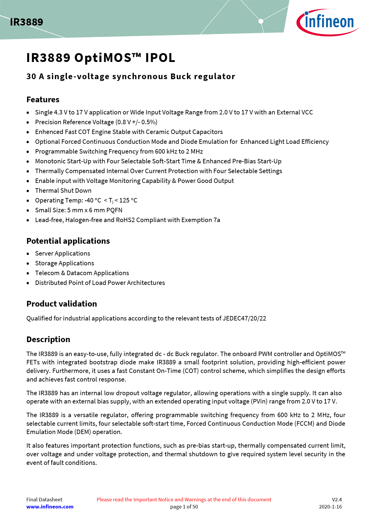IR3889. OptiMOS™ IPOL. 30 A single-voltage synchronous Buck regulator. Features. Potential applications. Product validation