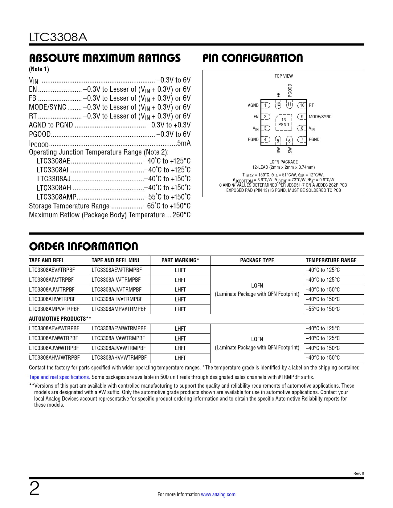 LTC3308AEV#WTRPBF LTC3308AEV#WTRMPBF LHFT –40°C to 125°C LTC3308AIV#WTRPBF LTC3308AIV#WTRMPBF LHFT LQFN –40°C to 125°C LTC3308AJV#WTRPBF LTC3308AJV#WTRMPBF LHFT (Laminate Package with QFN Footprint) –40°C to 150°C LTC3308AHV#WTRPBF LTC3308AHV#WTRMPBF LHFT –40°C to 150°C Contact the factory for parts specified with wider operating temperature ranges. *The temperature grade is identified by a label on the shipping container. Tape and reel specifications. Some packages are available in 500 unit reels through designated sales channels with #TRMPBF suffix.