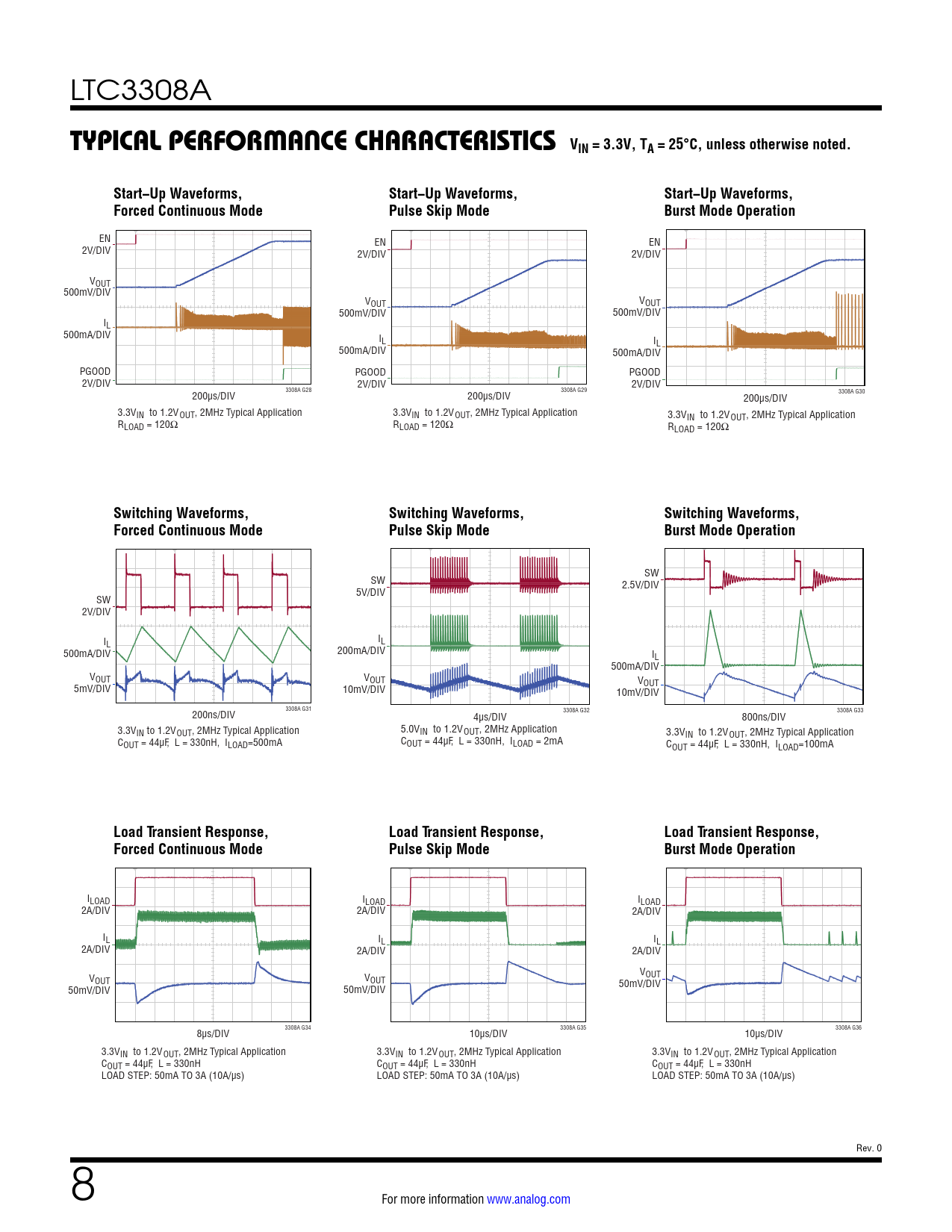 EN EN EN 2V/DIV 2V/DIV 2V/DIV VOUT 500mV/DIV V V OUT OUT 500mV/DIV 500mV/DIV IL 500mA/DIV IL IL 500mA/DIV 500mA/DIV PGOOD PGOOD PGOOD 2V/DIV 2V/DIV 2V/DIV 200µs/DIV 3308A G28 200µs/DIV 3308A G29 200µs/DIV 3308A G30 3.3VIN to 1.2VOUT, 2MHz Typical Application 3.3VIN to 1.2VOUT, 2MHz Typical Application 3.3VIN to 1.2VOUT, 2MHz Typical Application RLOAD = 120Ω RLOAD = 120Ω RLOAD = 120Ω