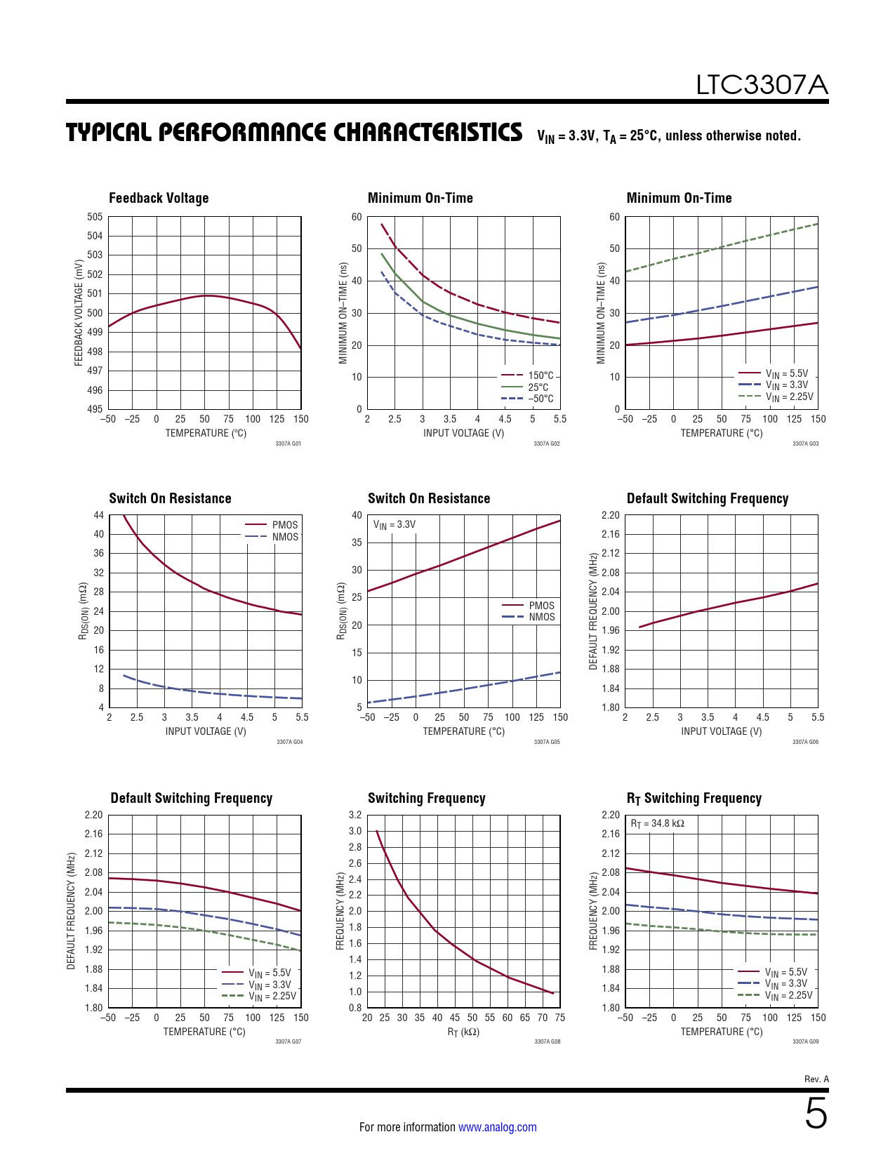 505 60 60 504 50 50 503 502 40 40 501 TAGE (mV) 500 30 30 499 20 20 498 FEEDBACK VOL MINIMUM ON–TIME (ns) MINIMUM ON–TIME (ns) 497 10 150°C V 10 IN = 5.5V 496 25°C VIN = 3.3V –50°C VIN = 2.25V 495 0 0 –50 –25 0 25 50 75 100 125 150 2 2.5 3 3.5 4 4.5 5 5.5 –50 –25 0 25 50 75 100 125 150 TEMPERATURE (ºC) INPUT VOLTAGE (V) TEMPERATURE (°C) 3307A G01 3307A G02 3307A G03