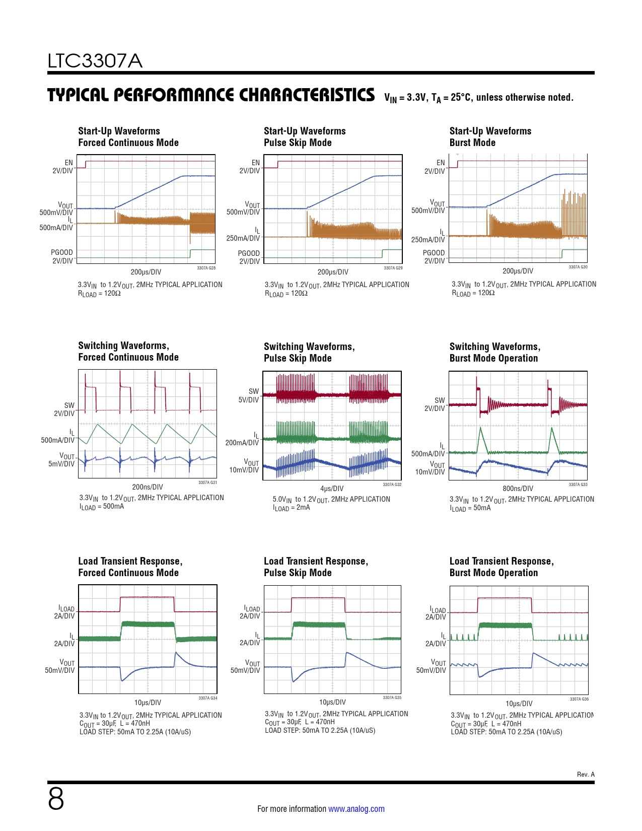 ILOAD ILOAD ILOAD 2A/DIV 2A/DIV 2A/DIV I I L L IL 2A/DIV 2A/DIV 2A/DIV VOUT VOUT VOUT 50mV/DIV 50mV/DIV 50mV/DIV 10µs/DIV 3307A G34 10µs/DIV 3307A G35 10µs/DIV 3307A G36 3.3V 3.3VIN to 1.2VOUT, 2MHz TYPICAL APPLICATION IN to 1.2VOUT, 2MHz TYPICAL APPLICATION 3.3VIN to 1.2VOUT, 2MHz TYPICAL APPLICATION C COUT = 30µF, L = 470nH OUT = 30µF, L = 470nH COUT = 30µF, L = 470nH LOAD STEP: 50mA TO 2.25A (10A/uS) LOAD STEP: 50mA TO 2.25A (10A/uS) LOAD STEP: 50mA TO 2.25A (10A/uS) Rev. A 8 For more information www.analog.com Document Outline Features Applications Typical Application Description Absolute Maximum Ratings Order Information Pin Configuration Electrical Characteristics Typical Performance Characteristics Pin Functions Block Diagram Operation Applications Information Typical Applications Package Description Revision History Typical Application Related Parts