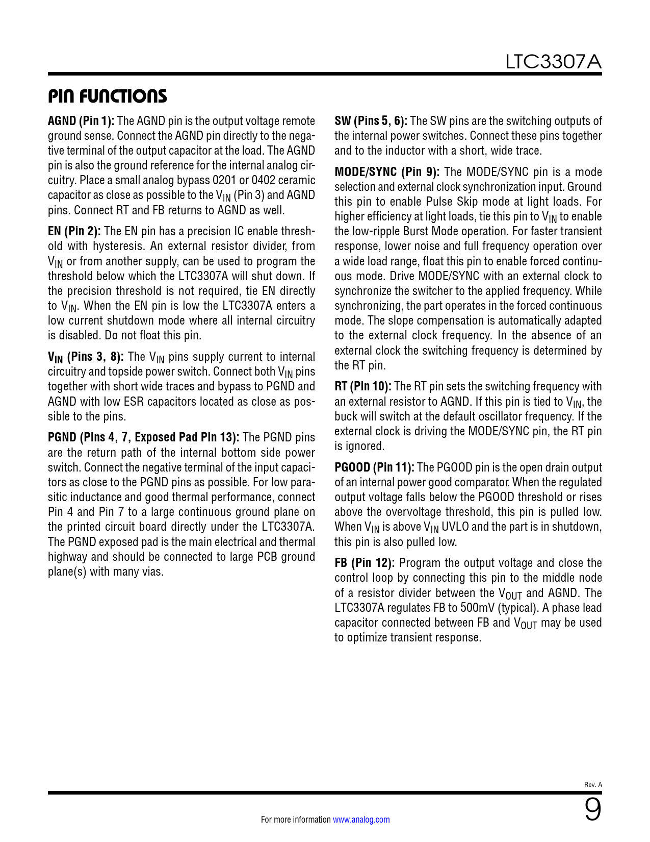 PIN FUNCTIONS AGND (Pin 1):. SW (Pins 5, 6):. MODE/SYNC (Pin 9):. EN (Pin 2):. IN (Pins 3, 8):. RT (Pin 10):