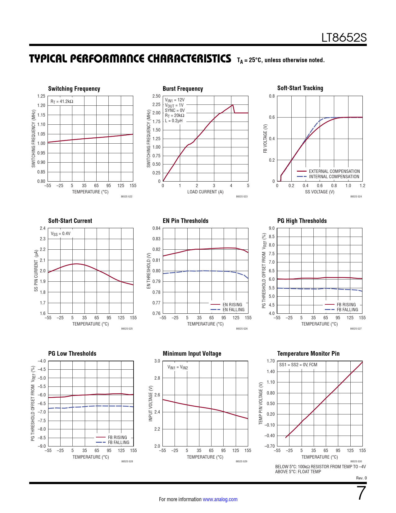 1.25 2.50 0.8 R V T = 41.2kΩ IN1 = 12V 1.20 2.25 VOUT = 1V SYNC = 0V 1.15 2.00 RT = 20kΩ 0.6 1.75 L = 0.2µH 1.10 1.50 1.05 1.25 TAGE (V) 0.4 1.00 1.00 0.95 FB VOL 0.75 0.90 0.2 SWITCHING FREQUENCY (MHz) 0.50 SWITCHING FREQUENCY (MHz) 0.85 0.25 EXTERNAL COMPENSATION INTERNAL COMPENSATION 0.80 0 0 –55 –25 5 35 65 95 125 155 0 1 2 3 4 5 0 0.2 0.4 0.6 0.8 1.0 1.2 TEMPERATURE (°C) LOAD CURRENT (A) SS VOLTAGE (V) 8652S G22 8652S G23 8652S G24