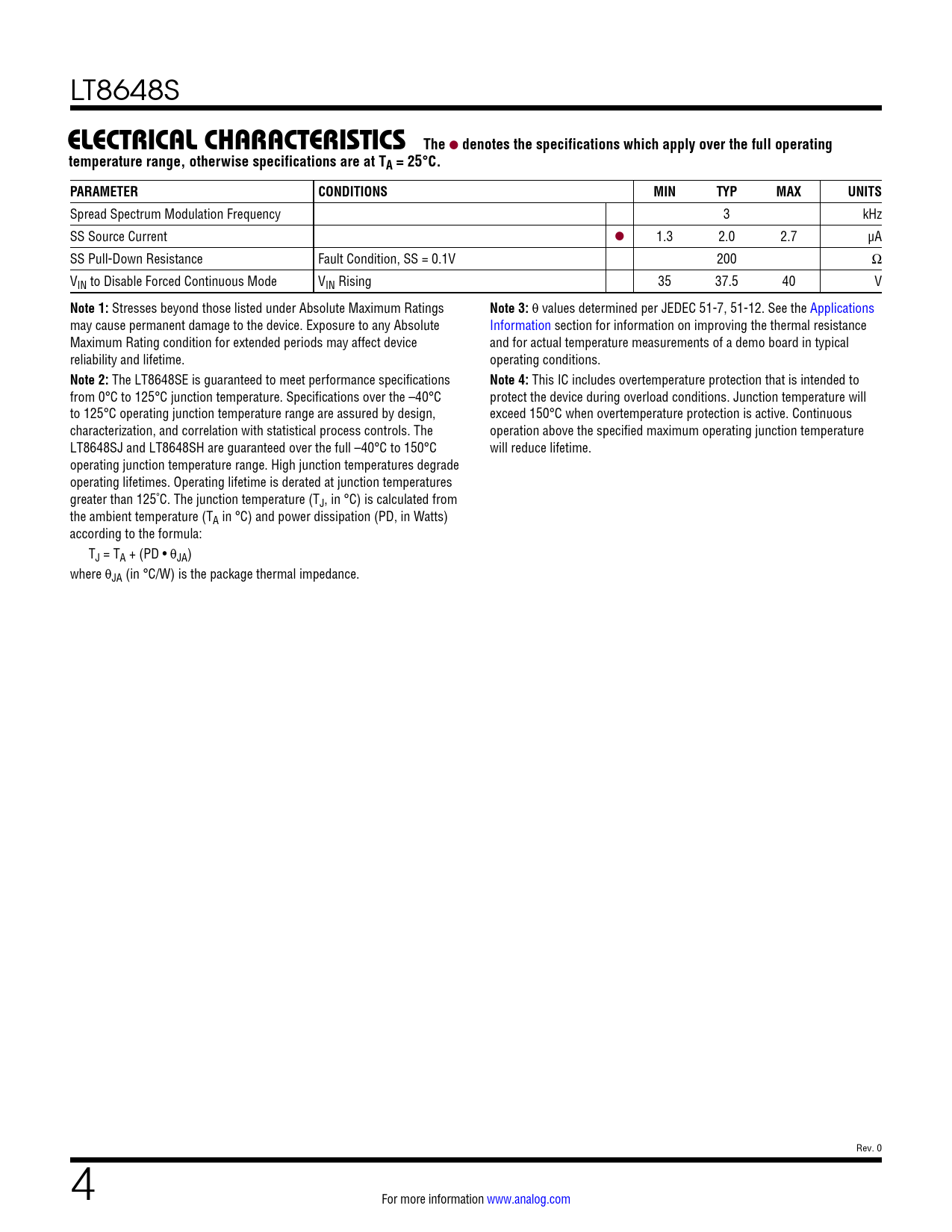 This IC includes overtemperature protection that is intended to from 0°C to 125°C junction temperature. Specifications over the –40°C protect the device during overload conditions. Junction temperature will to 125°C operating junction temperature range are assured by design, exceed 150°C when overtemperature protection is active. Continuous characterization, and correlation with statistical process controls. The operation above the specified maximum operating junction temperature LT8648SJ and LT8648SH are guaranteed over the full –40°C to 150°C will reduce lifetime. operating junction temperature range. High junction temperatures degrade operating lifetimes. Operating lifetime is derated at junction temperatures greater than 125˚C. The junction temperature (TJ, in °C) is calculated from the ambient temperature (TA in °C) and power dissipation (PD, in Watts) according to the formula: TJ = TA + (PD • JA) where JA (in °C/W) is the package thermal impedance. Rev. 0 4 For more information www.analog.com Document Outline Features Applications Typical Application Description Absolute Maximum Ratings Order Information Pin Configuration Electrical Characteristics Typical Performance Characteristics Pin Functions Block Diagram Operation Applications Information Typical Applications Package Description Typical Applications Related Parts