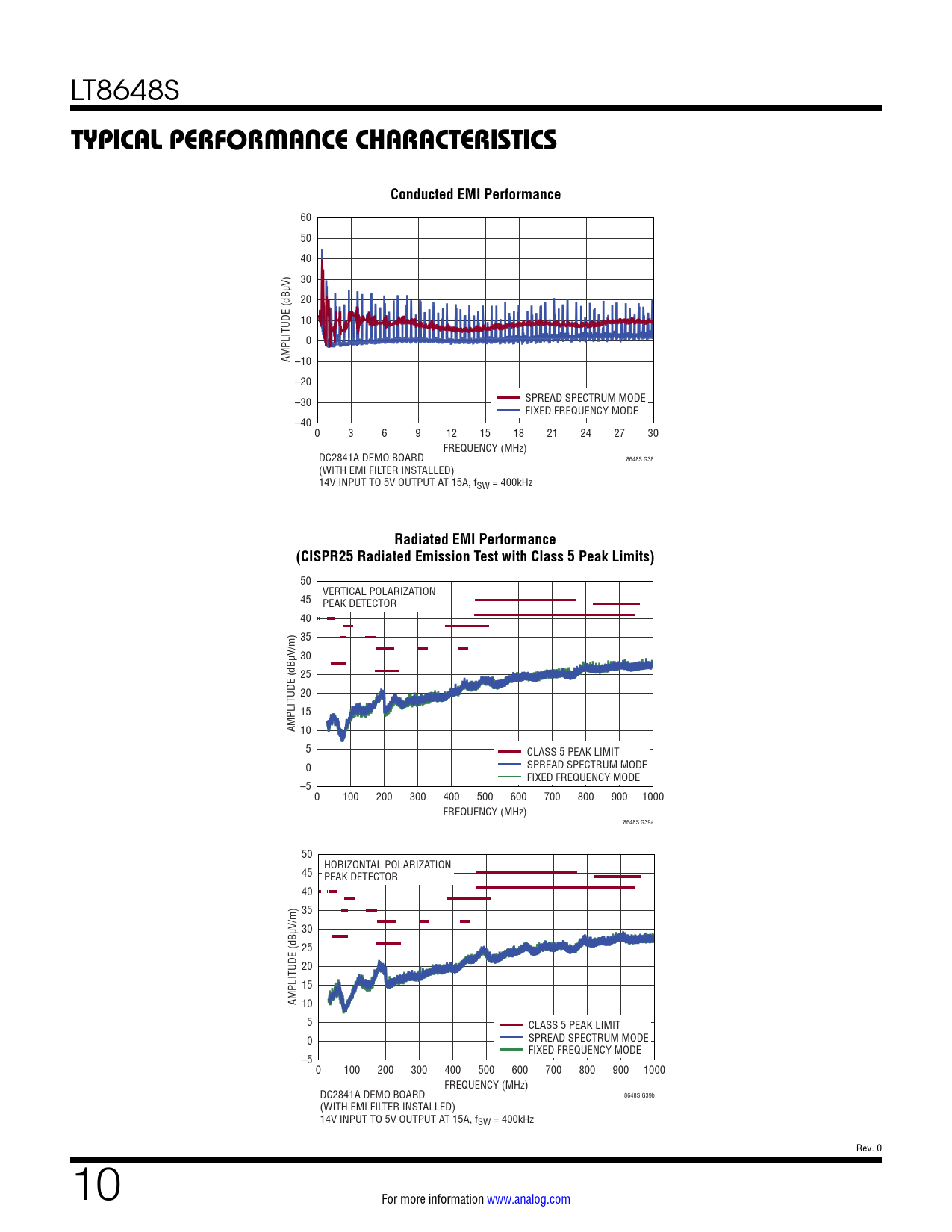 60 50 40 30 V) 20 10 0 AMPLITUDE (dBµ –10 –20 SPREAD SPECTRUM MODE –30 FIXED FREQUENCY MODE –40 0 3 6 9 12 15 18 21 24 27 30 FREQUENCY (MHz) DC2841A DEMO BOARD 8648S G38 (WITH EMI FILTER INSTALLED) 14V INPUT TO 5V OUTPUT AT 15A, fSW = 400kHz