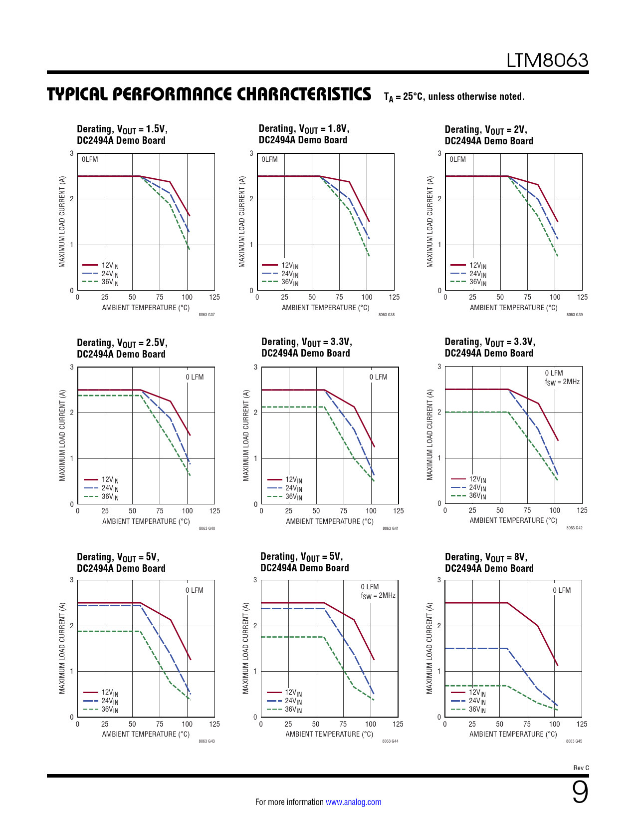 TYPICAL PERFORMANCE CHARACTERISTICS TA = 25°C, unless otherwise noted. Derating, VOUT = 1.5V, Derating, VOUT = 1.8V, Derating, VOUT = 2V, DC2494A Demo Board DC2494A Demo Board DC2494A Demo Board