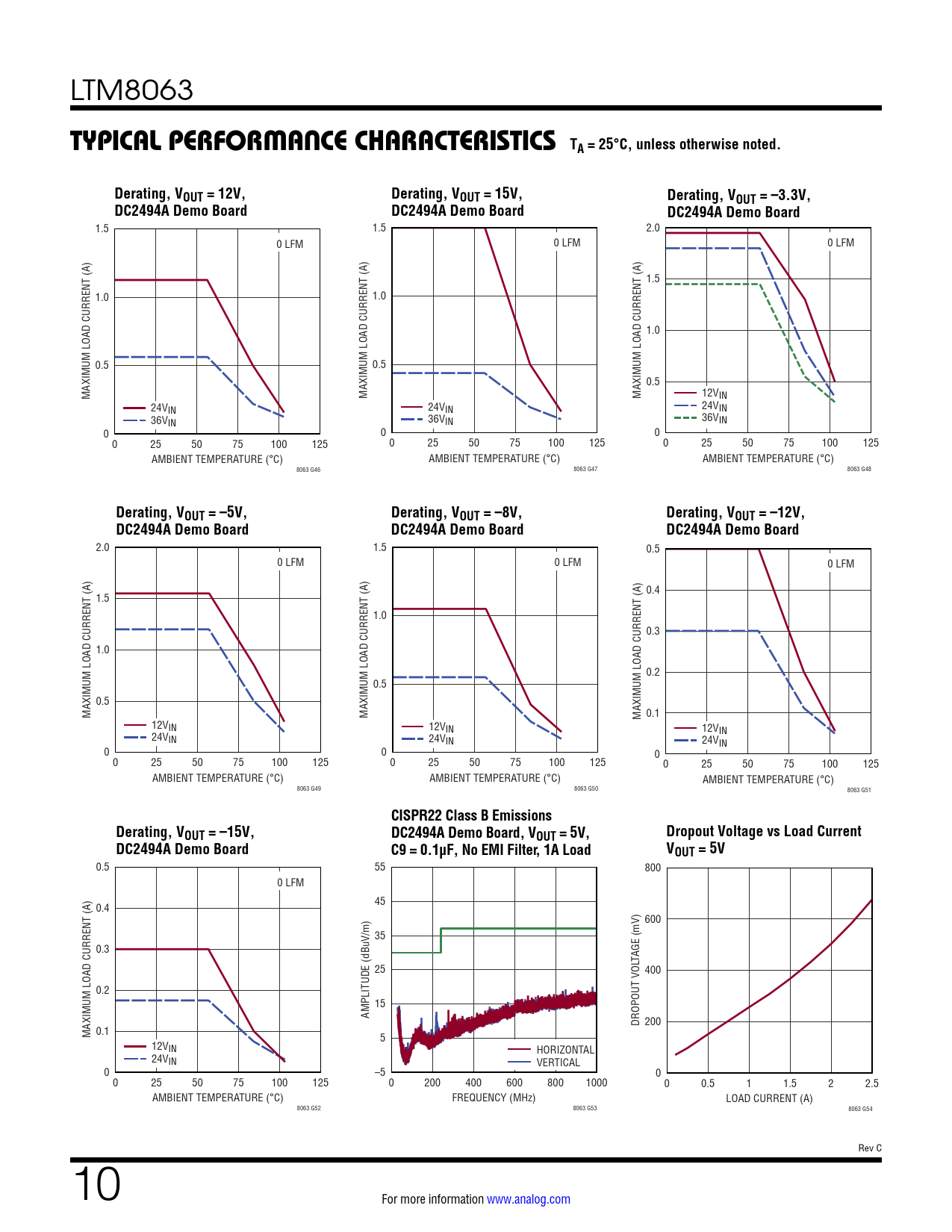 CISPR22 Class B Emissions Derating, VOUT = –15V, DC2494A Demo Board, V Dropout Voltage vs Load Current OUT = 5V, DC2494A Demo Board C9 = 0.1µF, No EMI Filter, 1A Load VOUT = 5V
