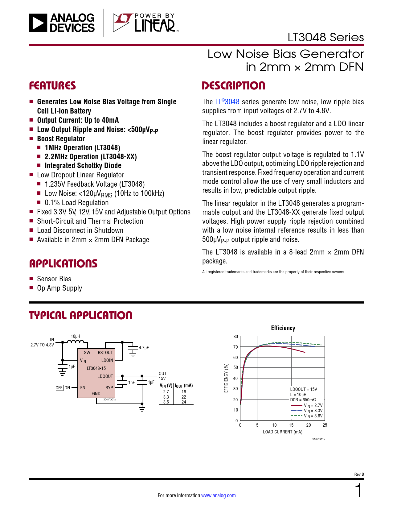 LT3048 Series Low Noise Bias Generator in 2mm × 2mm DFN FEATURESDESCRIPTION n Generates Low Noise Bias Voltage from Single The LT®3048 series generate low noise, low ripple bias Cell Li-Ion Battery supplies from input voltages of 2.7V to 4.8V. n Output Current: Up to 40mA The LT3048 includes a boost regulator and a LDO linear n Low Output Ripple and Noise: <500µVP-P regulator. The boost regulator provides power to the n Boost Regulator linear regulator. n 1MHz Operation (LT3048) n The boost regulator output voltage is regulated to 1.1V 2.2MHz Operation (LT3048-XX) n above the LDO output, optimizing LDO ripple rejection and Integrated Schottky Diode n transient response. Fixed frequency operation and current Low Dropout Linear Regulator n mode control allow the use of very small inductors and 1.235V Feedback Voltage (LT3048) n results in low, predictable output ripple. Low Noise: <120µVRMS (10Hz to 100kHz) n 0.1% Load Regulation The linear regulator in the LT3048 generates a program- n Fixed 3.3V, 5V, 12V, 15V and Adjustable Output Options mable output and the LT3048-XX generate fixed output n Short-Circuit and Thermal Protection voltages. High power supply ripple rejection combined n Load Disconnect in Shutdown with a low noise internal reference results in less than n Available in 2mm × 2mm DFN Package 500µVP-P output ripple and noise. The LT3048 is available in a 8-lead 2mm × 2mm DFN package. APPLICATIONS All registered trademarks and trademarks are the property of their respective owners. n Sensor Bias n Op Amp Supply TYPICAL APPLICATIONEfficiency 10µH 80 IN 2.7V TO 4.8V 4.7µF 70 SW BSTOUT 60 VIN LDOIN 1µF LT3048-15 50 OUT LDOOUT 15V 40 1nF 1µF OFF ON EN BYP VIN (V) IOUT (mA) LDOOUT = 15V GND 2.7 19 EFFICIENCY (%) 30 3.3 22 L = 10µH 3048 TA01a 3.6 24 20 DCR = 650mΩ VIN = 2.7V 10 VIN = 3.3V VIN = 3.6V 0 0 5 10 15 20 25 LOAD CURRENT (mA) 3048 TA01b Rev B For more information www.analog.com 1 Document Outline Features Applications Typical Application Description Absolute Maximum Ratings Pin Configuration Order Information Electrical Characteristics Typical Performance Characteristics Pin Functions LT3048 LT3048-xx LT3048 Block Diagrams Operation Applications Information Package Description Revision History Related Parts