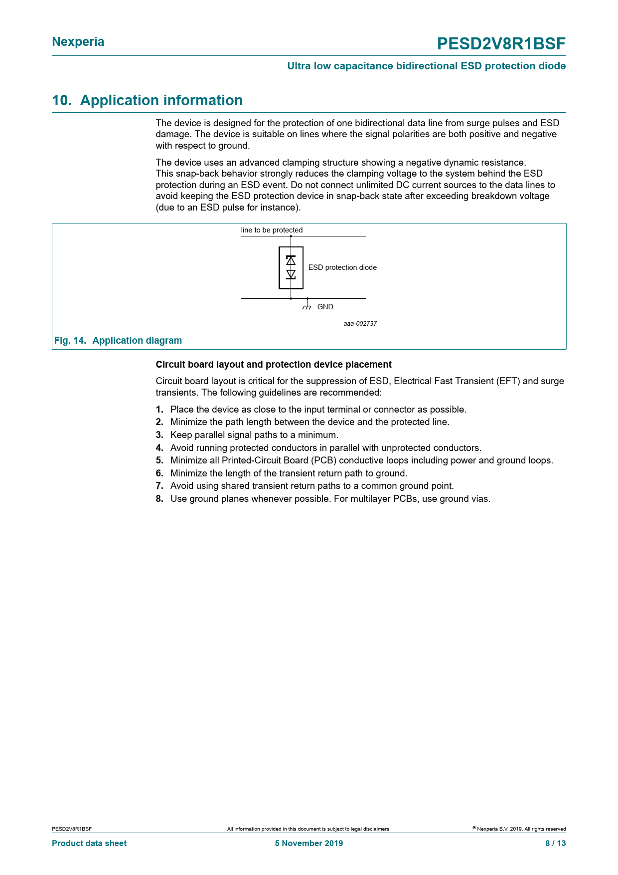 Use ground planes whenever possible. For multilayer PCBs, use ground vias. PESD2V8R1BSF All information provided in this document is subject to legal disclaimers. © Nexperia B.V. 2019. All rights reserved