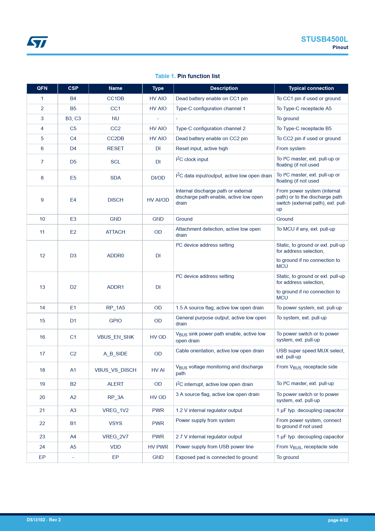 Pages / Page32 / 4 — STUSB4500L. Pinout. Table 1. Pin function list. QFN. CSP. Name. Type. …