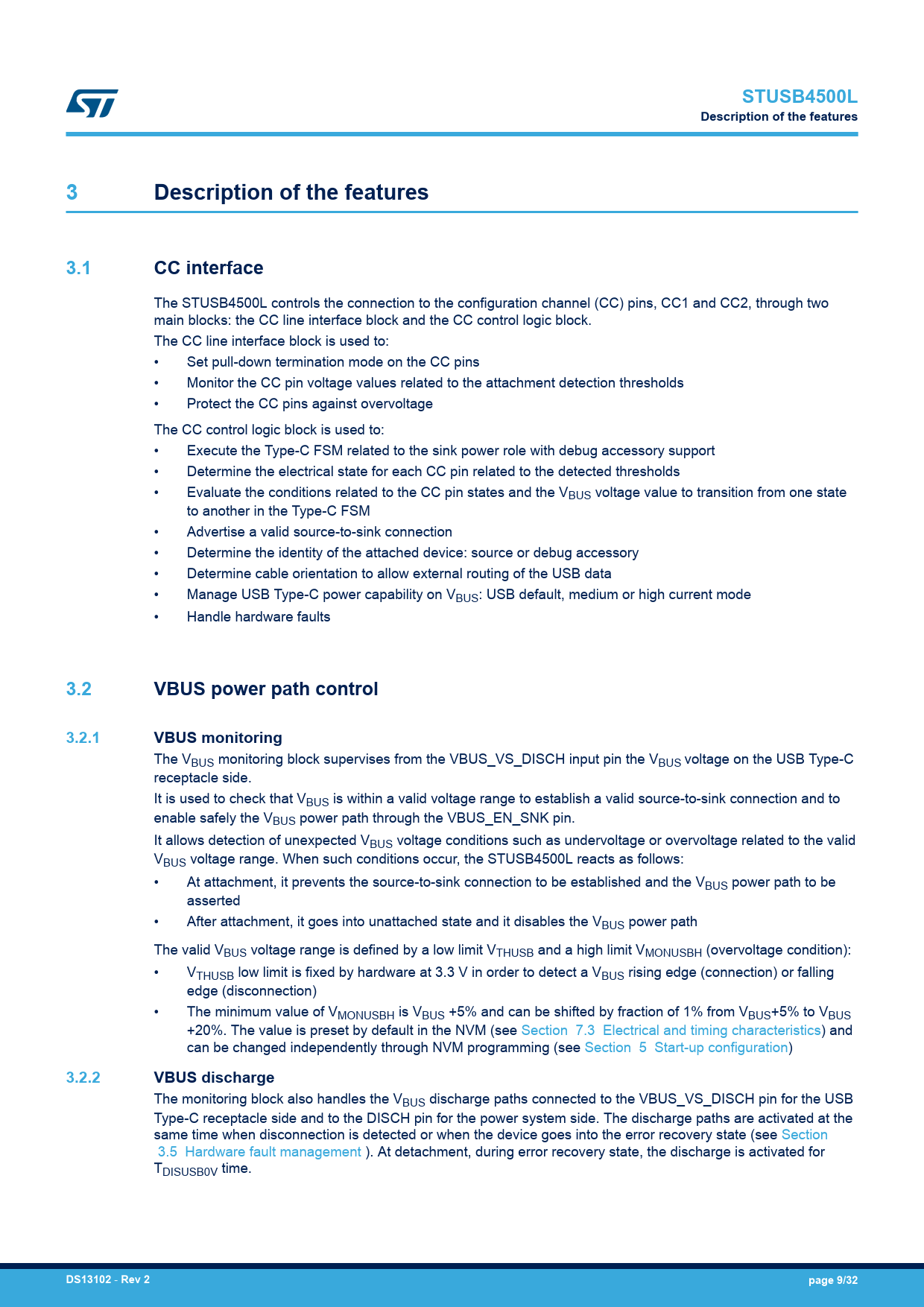Pages / Page32 / 9 — STUSB4500L. Description of the features. 3.1. CC interface. 3.2. VBUS …