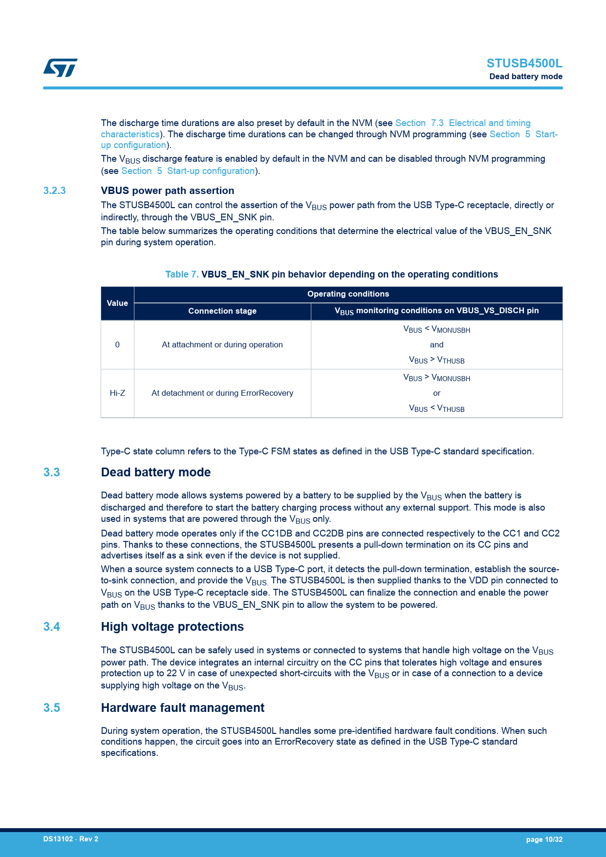 Pages / Page32 / 10 — STUSB4500L. Dead battery mode. 3.2.3. VBUS power path assertion