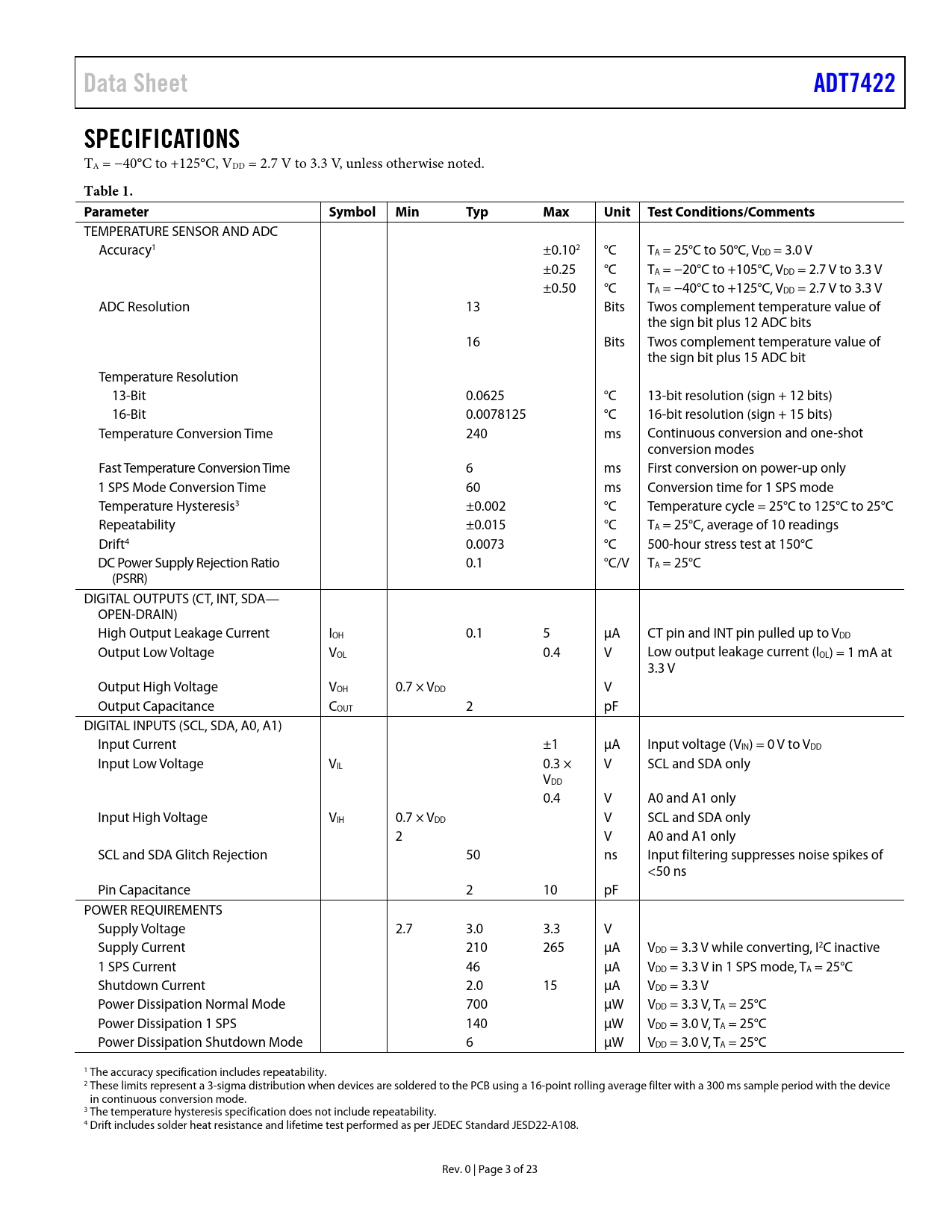 Data SheetADT7422SPECIFICATIONS TA = −40°C to +125°C, VDD = 2.7 V to 3.3 V, unless otherwise noted. Table 1. Parameter SymbolMinTypMaxUnitTestConditions/Comments TEMPERATURE SENSOR AND ADC Accuracy1 ±0.102 °C TA = 25°C to 50°C, VDD = 3.0 V ±0.25 °C TA = −20°C to +105°C, VDD = 2.7 V to 3.3 V ±0.50 °C TA = −40°C to +125°C, VDD = 2.7 V to 3.3 V ADC Resolution 13 Bits Twos complement temperature value of the sign bit plus 12 ADC bits 16 Bits Twos complement temperature value of the sign bit plus 15 ADC bit Temperature Resolution 13-Bit 0.0625 °C 13-bit resolution (sign + 12 bits) 16-Bit 0.0078125 °C 16-bit resolution (sign + 15 bits) Temperature Conversion Time 240 ms Continuous conversion and one-shot conversion modes Fast Temperature Conversion Time 6 ms First conversion on power-up only 1 SPS Mode Conversion Time 60 ms Conversion time for 1 SPS mode Temperature Hysteresis3 ±0.002 °C Temperature cycle = 25°C to 125°C to 25°C Repeatability ±0.015 °C TA = 25°C, average of 10 readings Drift4 0.0073 °C 500-hour stress test at 150°C DC Power Supply Rejection Ratio 0.1 °C/V TA = 25°C (PSRR) DIGITAL OUTPUTS (CT, INT, SDA— OPEN-DRAIN) High Output Leakage Current IOH 0.1 5 μA CT pin and INT pin pulled up to VDD Output Low Voltage VOL 0.4 V Low output leakage current (IOL) = 1 mA at 3.3 V Output High Voltage VOH 0.7 × VDD V Output Capacitance COUT 2 pF DIGITAL INPUTS (SCL, SDA, A0, A1) Input Current ±1 μA Input voltage (VIN) = 0 V to VDD Input Low Voltage VIL 0.3 × V SCL and SDA only VDD 0.4 V A0 and A1 only Input High Voltage VIH 0.7 × VDD V SCL and SDA only 2 V A0 and A1 only SCL and SDA Glitch Rejection 50 ns Input filtering suppresses noise spikes of <50 ns Pin Capacitance 2 10 pF POWER REQUIREMENTS Supply Voltage 2.7 3.0 3.3 V Supply Current 210 265 μA VDD = 3.3 V while converting, I2C inactive 1 SPS Current 46 μA VDD = 3.3 V in 1 SPS mode, TA = 25°C Shutdown Current 2.0 15 μA VDD = 3.3 V Power Dissipation Normal Mode 700 μW VDD = 3.3 V, TA = 25°C Power Dissipation 1 SPS 140 μW VDD = 3.0 V, TA = 25°C Power Dissipation Shutdown Mode 6 μW VDD = 3.0 V, TA = 25°C 1 The accuracy specification includes repeatability. 2 These limits represent a 3-sigma distribution when devices are soldered to the PCB using a 16-point rolling average filter with a 300 ms sample period with the device in continuous conversion mode. 3 The temperature hysteresis specification does not include repeatability. 4 Drift includes solder heat resistance and lifetime test performed as per JEDEC Standard JESD22-A108. Rev. 0 | Page 3 of 23 Document Outline FEATURES APPLICATIONS GENERAL DESCRIPTION PRODUCT HIGHLIGHTS FUNCTIONAL BLOCK DIAGRAM TABLE OF CONTENTS REVISION HISTORY SPECIFICATIONS I2C TIMING SPECIFICATIONS Timing Diagram ABSOLUTE MAXIMUM RATINGS THERMAL RESISTANCE ESD CAUTION PIN CONFIGURATION AND FUNCTION DESCRIPTIONS TYPICAL PERFORMANCE CHARACTERISTICS THEORY OF OPERATION CIRCUIT INFORMATION CONVERTER DETAILS NORMAL MODE ONE SHOT MODE CT and INT Operation in One Shot Mode 1 SPS MODE SHUTDOWN MODE FAULT QUEUE TEMPERATURE DATA FORMAT TEMPERATURE CONVERSION FORMULAS 16-Bit Temperature Data Format 13-Bit Temperature Data Format 10-Bit Temperature Data Format 9-Bit Temperature Data Format REGISTERS ADDRESS POINTER REGISTER TEMPERATURE VALUE REGISTERS STATUS REGISTER CONFIGURATION REGISTER THIGH SETPOINT REGISTERS TLOW SETPOINT REGISTERS TCRIT SETPOINT REGISTERS THYST SETPOINT REGISTER ID REGISTER SERIAL INTERFACE SERIAL BUS ADDRESS WRITING DATA READING DATA RESET GENERAL CALL INT AND CT OUTPUTS UNDERTEMPERATURE AND OVERTEMPERATURE DETECTION Comparator Mode Interrupt Mode APPLICATIONS INFORMATION THERMAL RESPONSE TIME SUPPLY DECOUPLING POWERING FROM A SWITCHING REGULATOR TEMPERATURE MEASUREMENT QUICK GUIDE TO MEASURING TEMPERATURE OUTLINE DIMENSIONS ORDERING GUIDE