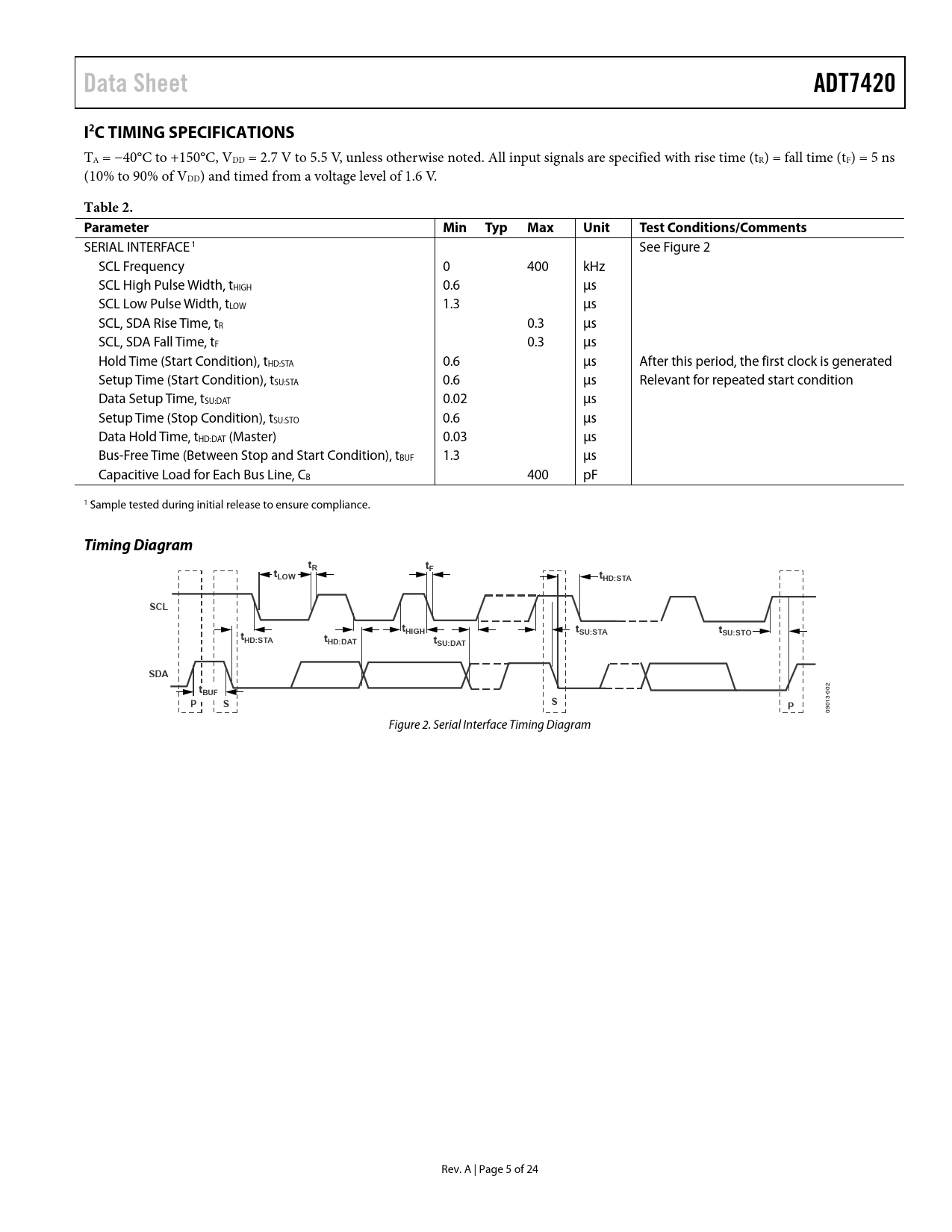 Data Sheet ADT7420 I2C TIMING SPECIFICATIONS Table 2 Parameter Min Typ Max Unit Test Conditions/Comments Timing Diagram LOW